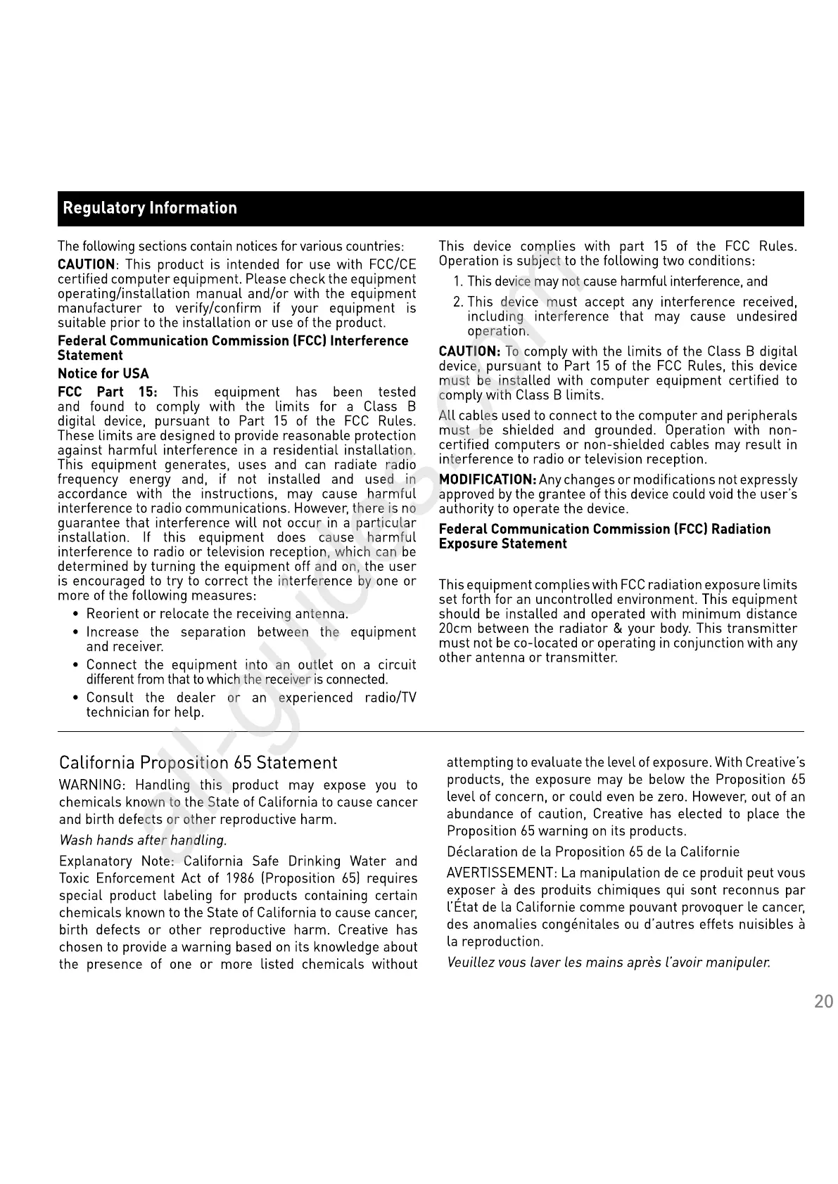 Creative ZiiSound DSx - Regulatory Information; FCC Interference and Exposure Statements; California Proposition 65 Warning