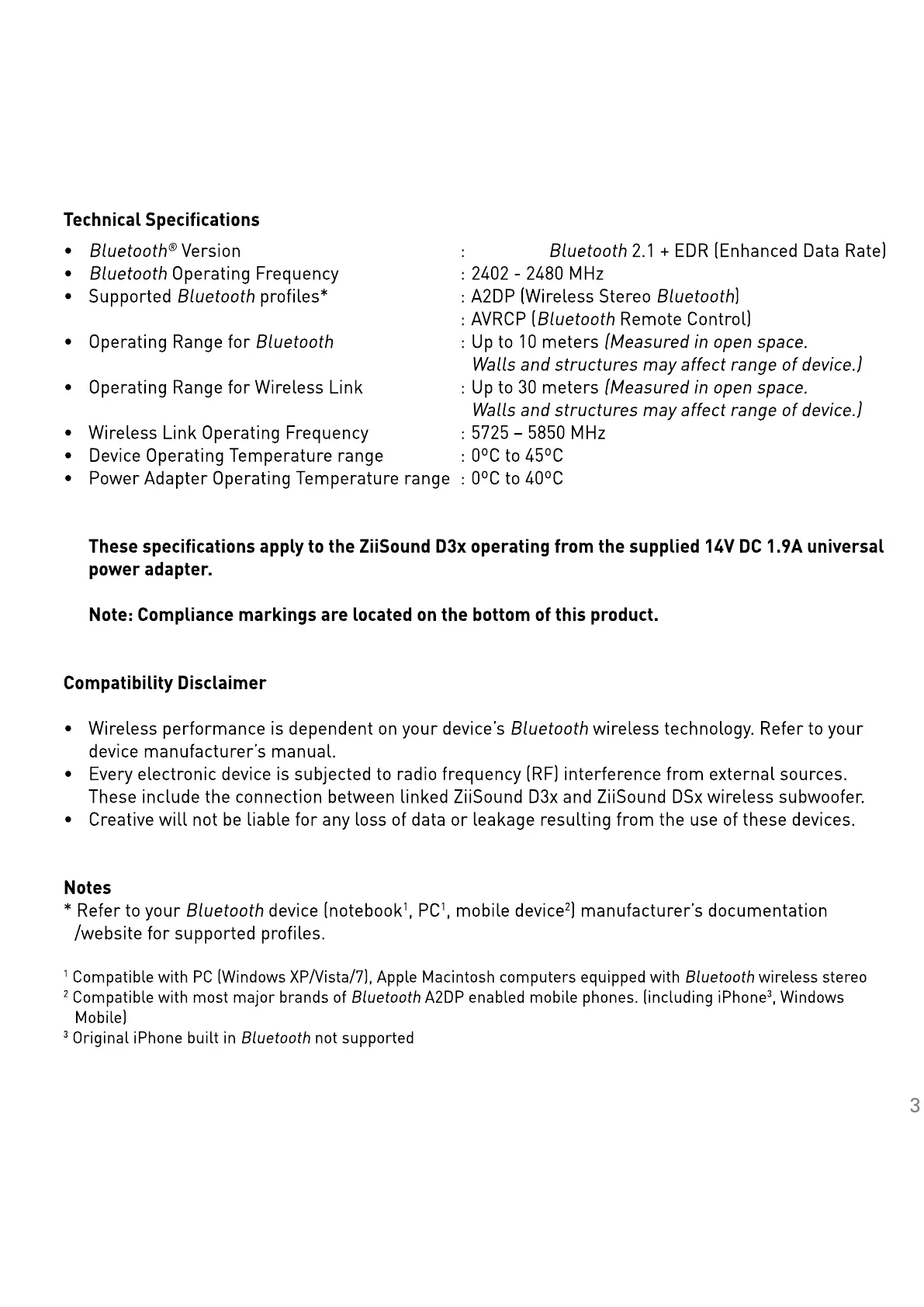 Creative ZiiSound DSx - Technical Specifications; Bluetooth and Wireless Link Details; Device and Operating Parameters; Compatibility Disclaimer