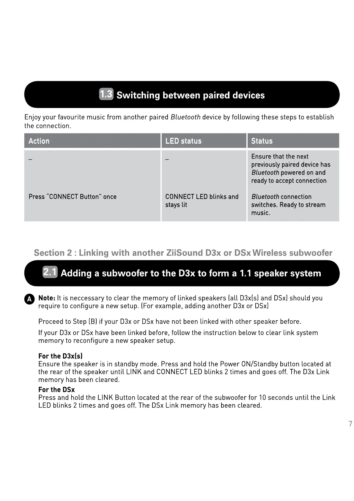 Creative ZiiSound DSx - Switching Between Paired Bluetooth Devices; Linking ZiiSound Speakers; Adding Subwoofer for 1.1 Speaker System