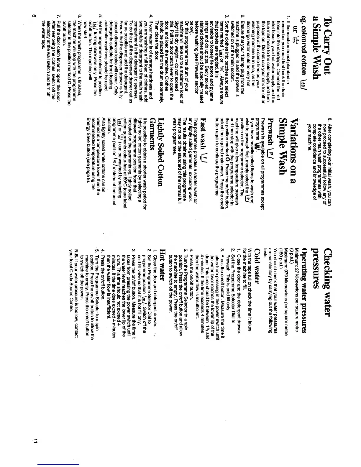 Creda 1000 Supaspeed - Washing Programmes and Water Pressure; Simple Wash Procedure