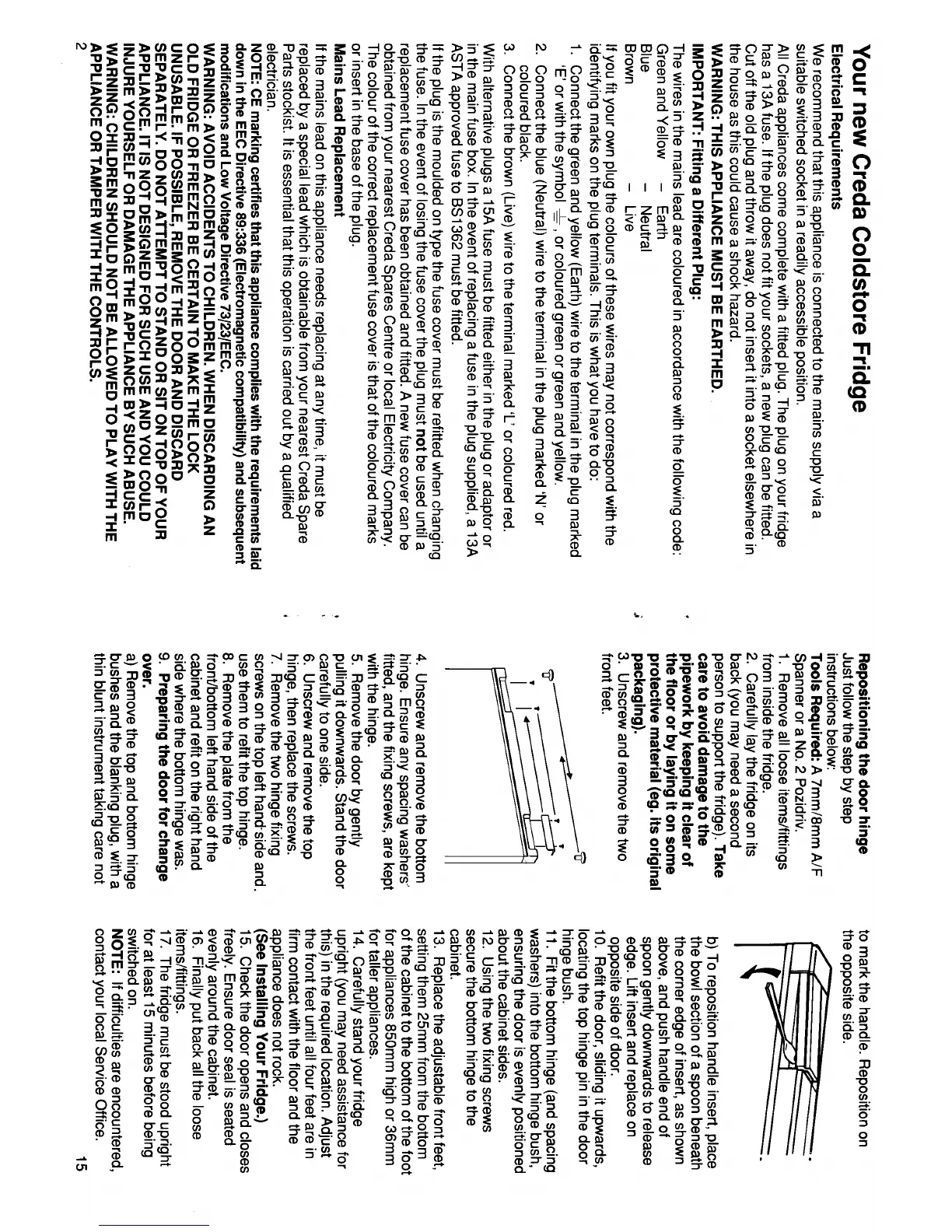 Creda Coldstore 86102 - Your new Creda Coldstore Fridge; Electrical Requirements; Mains Lead Replacement; Repositioning the door hinge