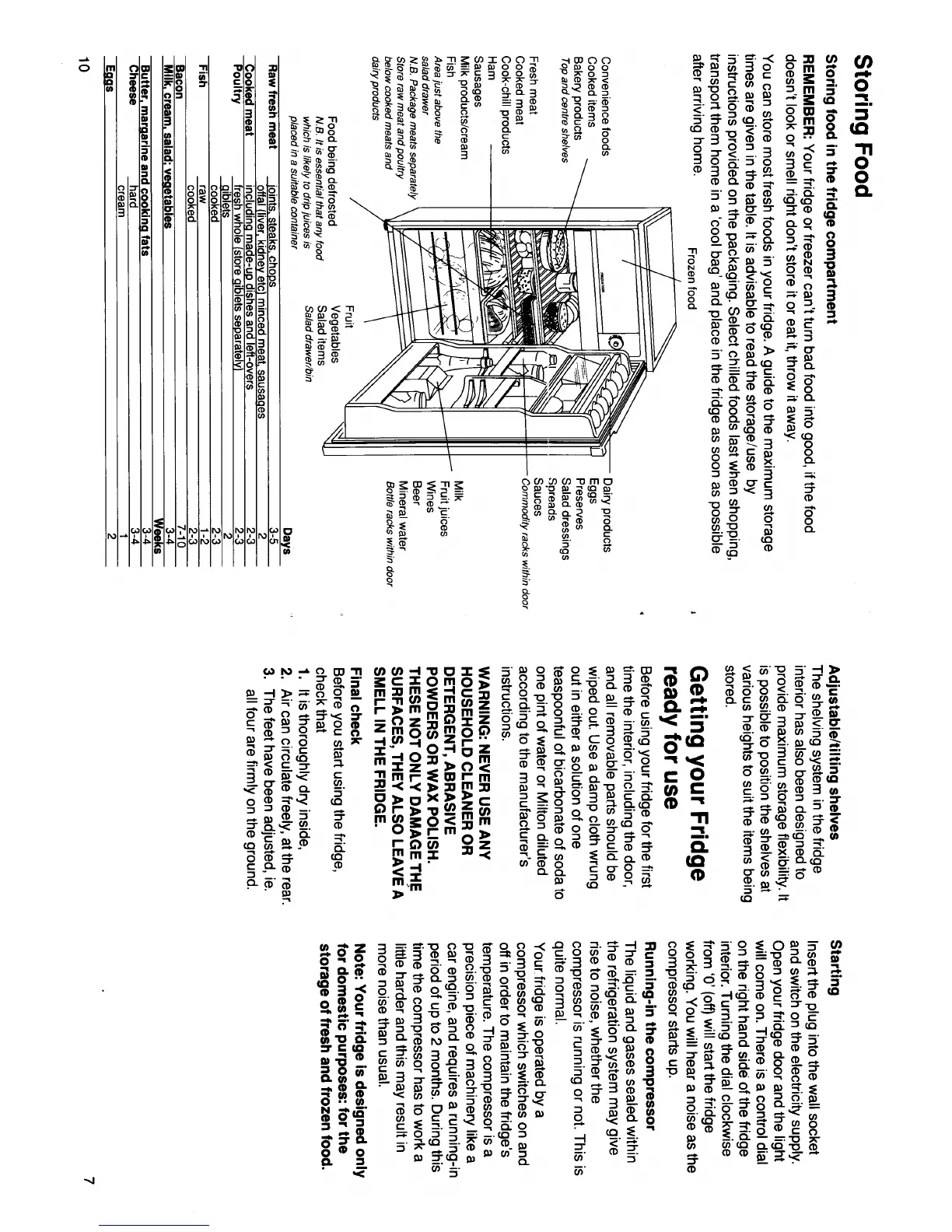 Creda Coldstore 86102 - Storing food in the fridge compartment; Getting your Fridge ready for use; Starting; Running-in the compressor
