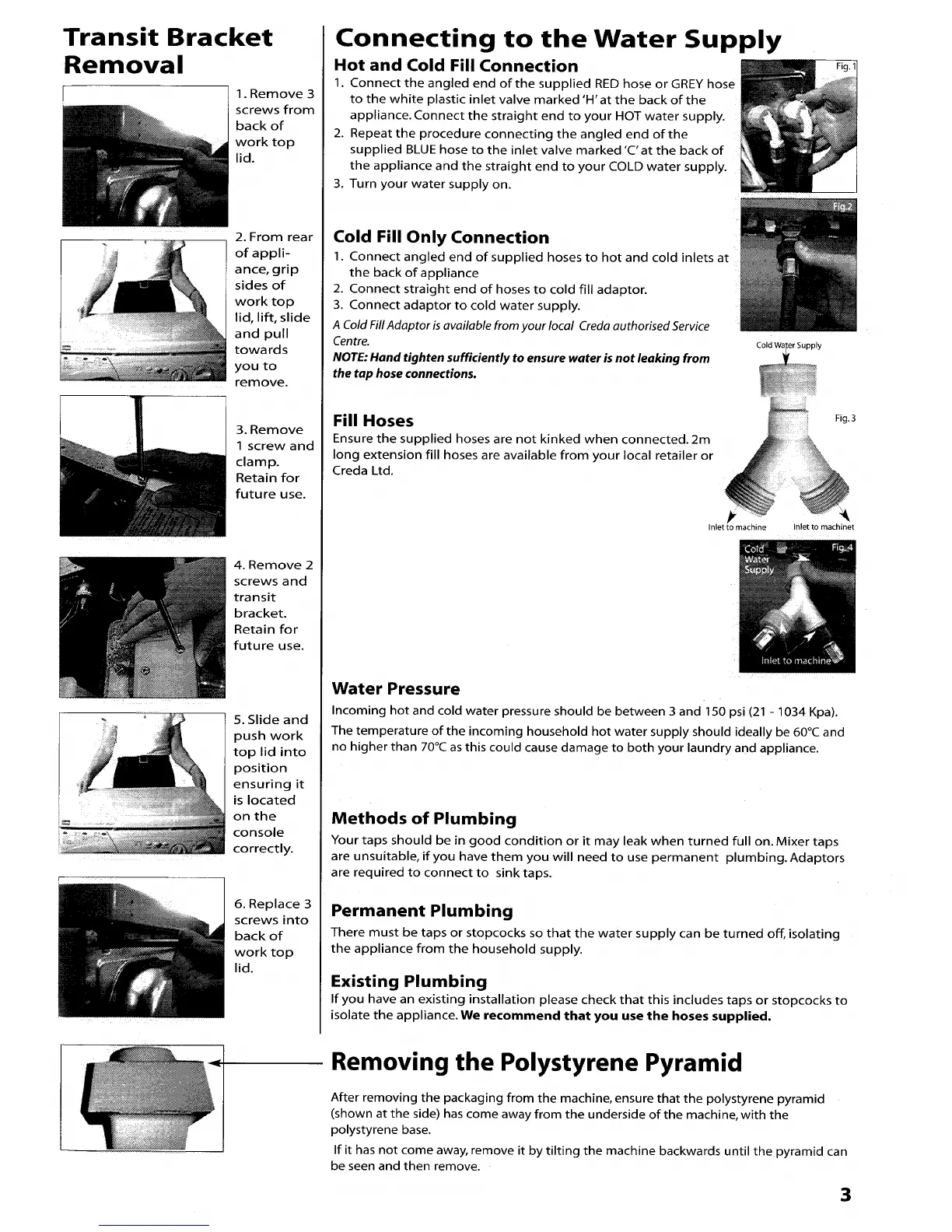 Creda Simplicity 1000 - Installation Procedures; Transit Bracket Removal; Water Supply Connection; Polystyrene Pyramid Removal