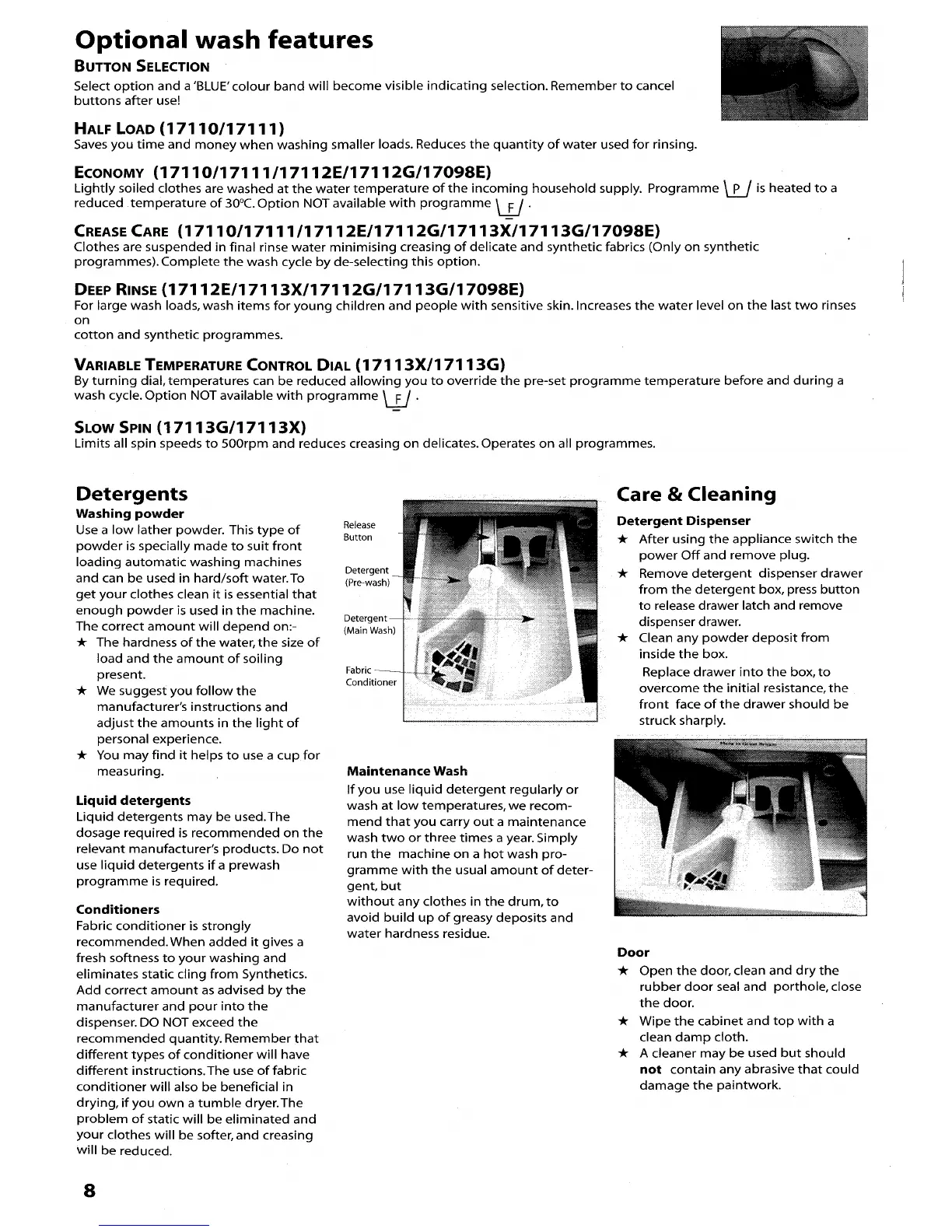 Creda Simplicity 1000 - Features, Detergents, and Care; Optional Wash Features; Detergents, Maintenance, and Cleaning