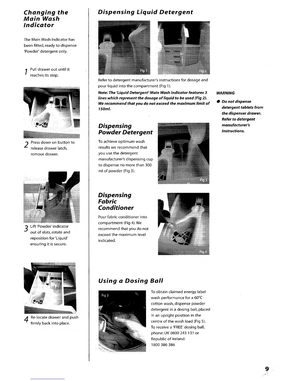 Creda Simplicity 1000 - Detergent Dispenser Usage; Changing Main Wash Indicator; Dispensing Detergents and Conditioner; Using a Dosing Ball