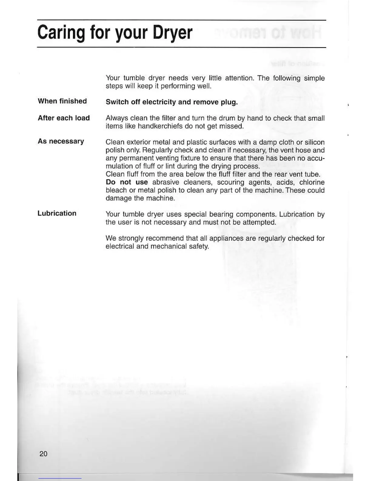 Your tumble dryer uses special beafing componenls. Lubricailon by