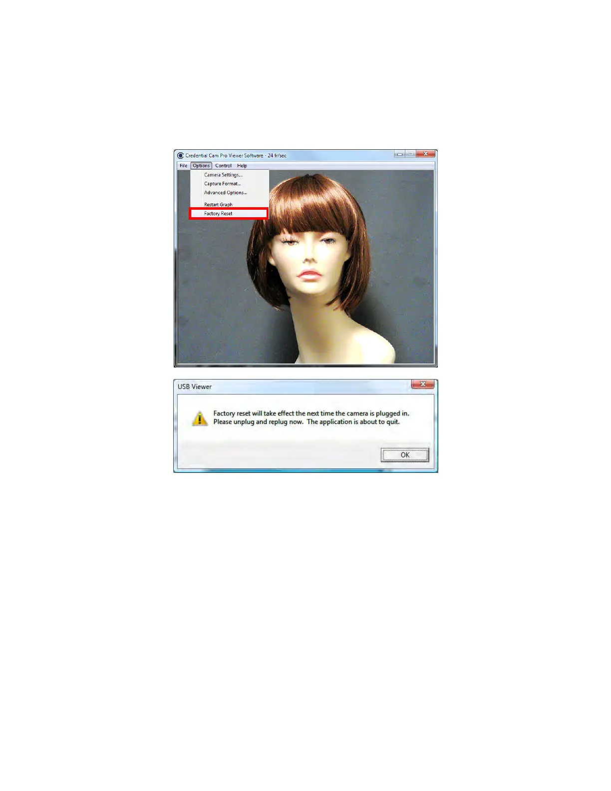 Factory Reset will bring up a dialog box. If “OK” is selected the camera will be reset the next time it is