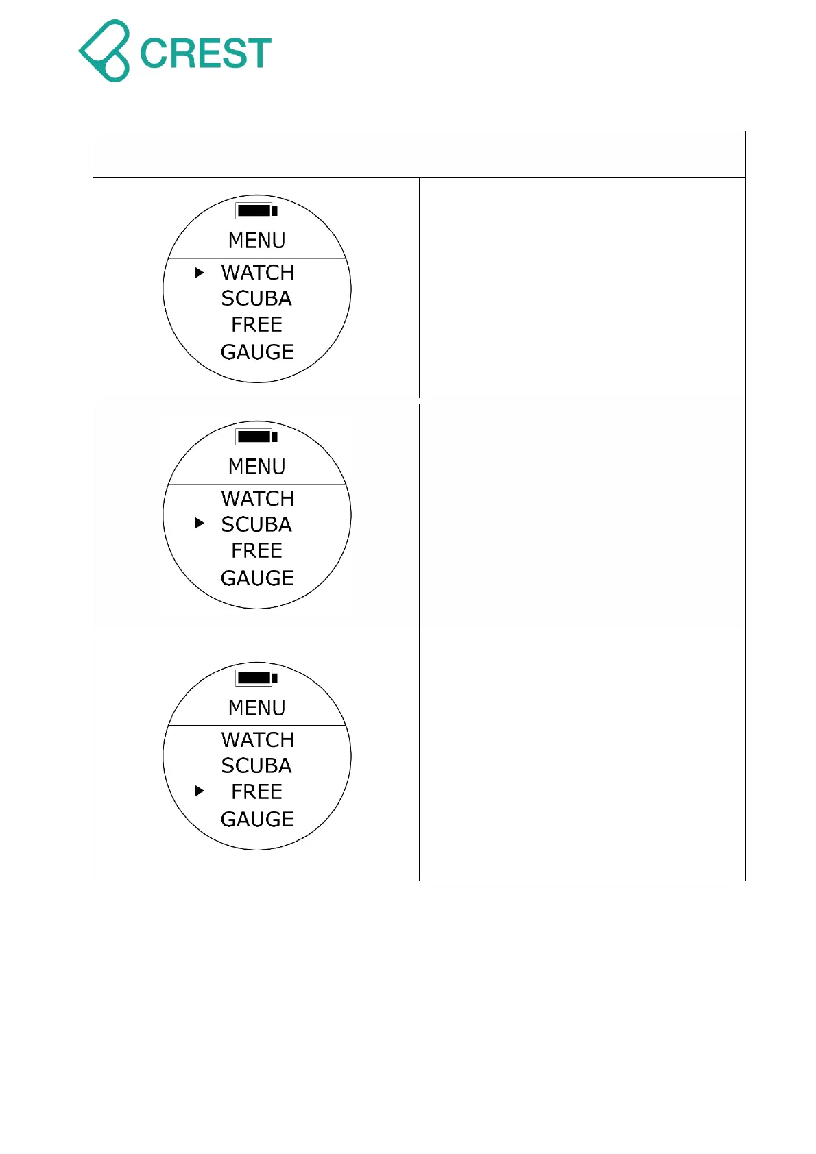 Crest Audio CR4 - Dive Mode Menu: Watch, Scuba, Freediving; Watch Mode Description; Scuba Mode Description; Freediving Mode Description
