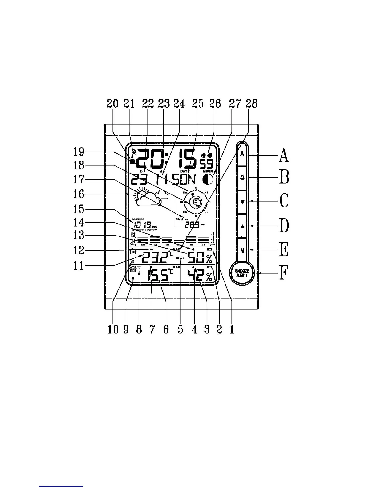 A = Alert, B = Alarm, C= keuze NEER, D= keuze OP, E = Mode, F = Sluimerfunctie/verlichting