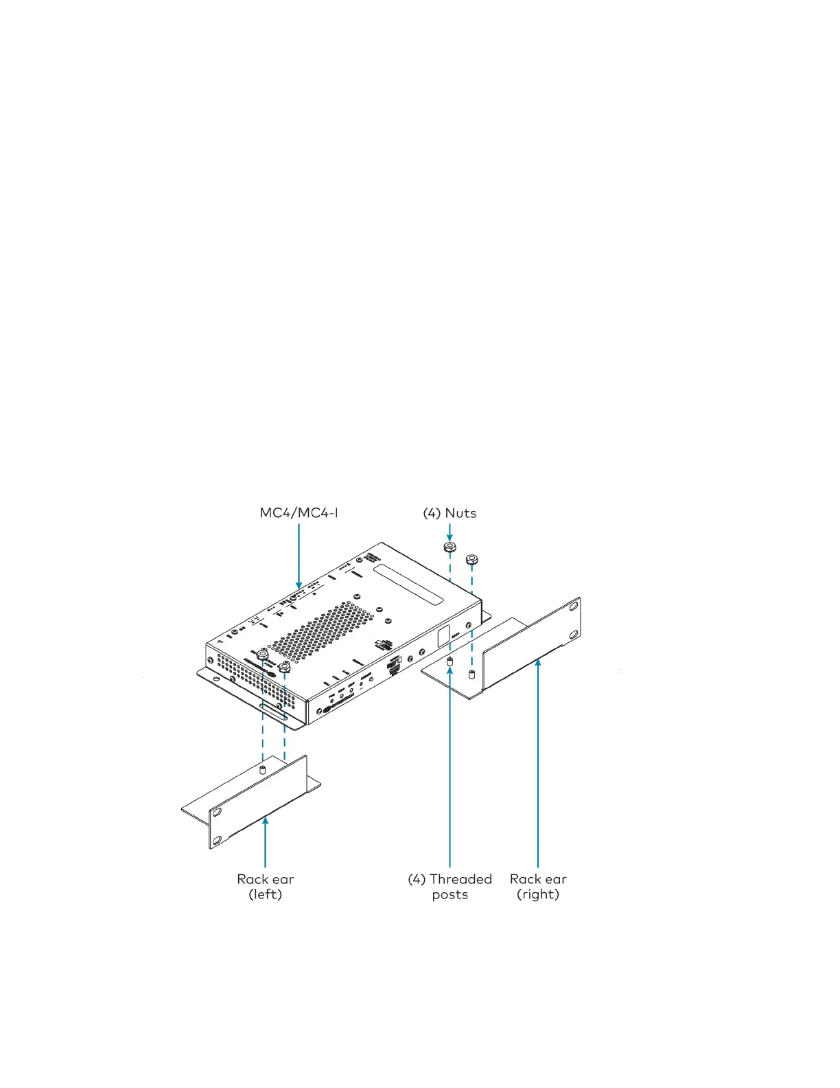 b. Attach the four provided nuts to the threaded posts to secure the rack ears to the