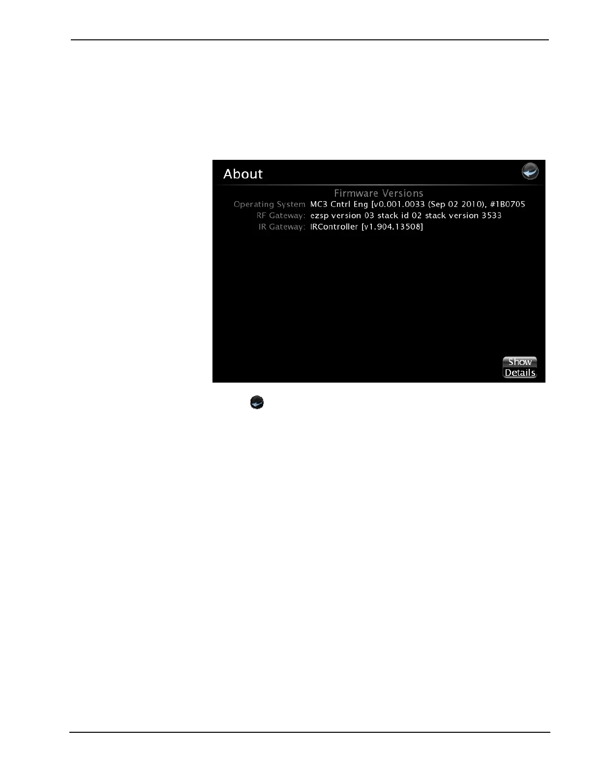 displays firmware versions for the operating system, RF Gateway, and IR Gateway.