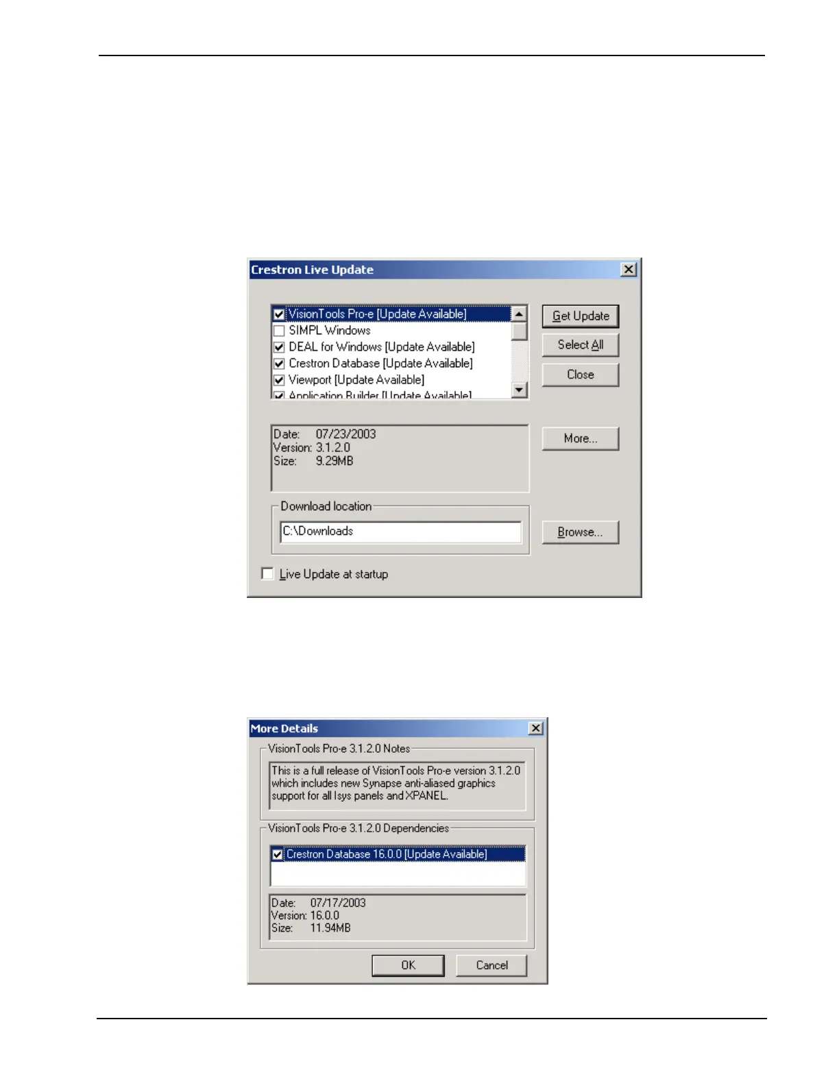display list of Crestron software programs and databases. Live Update will compare