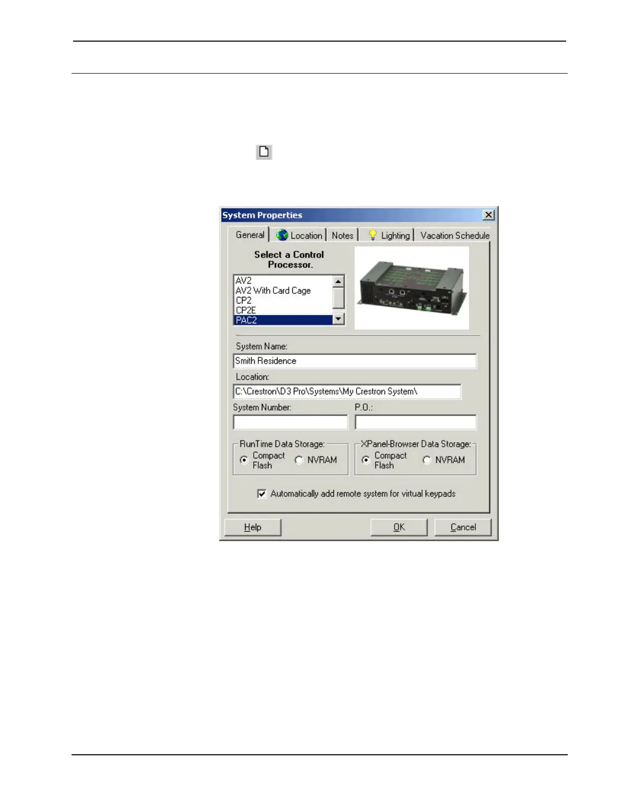 2. Click the General tab and select a control system, i.e., the PAC2, Crestron's