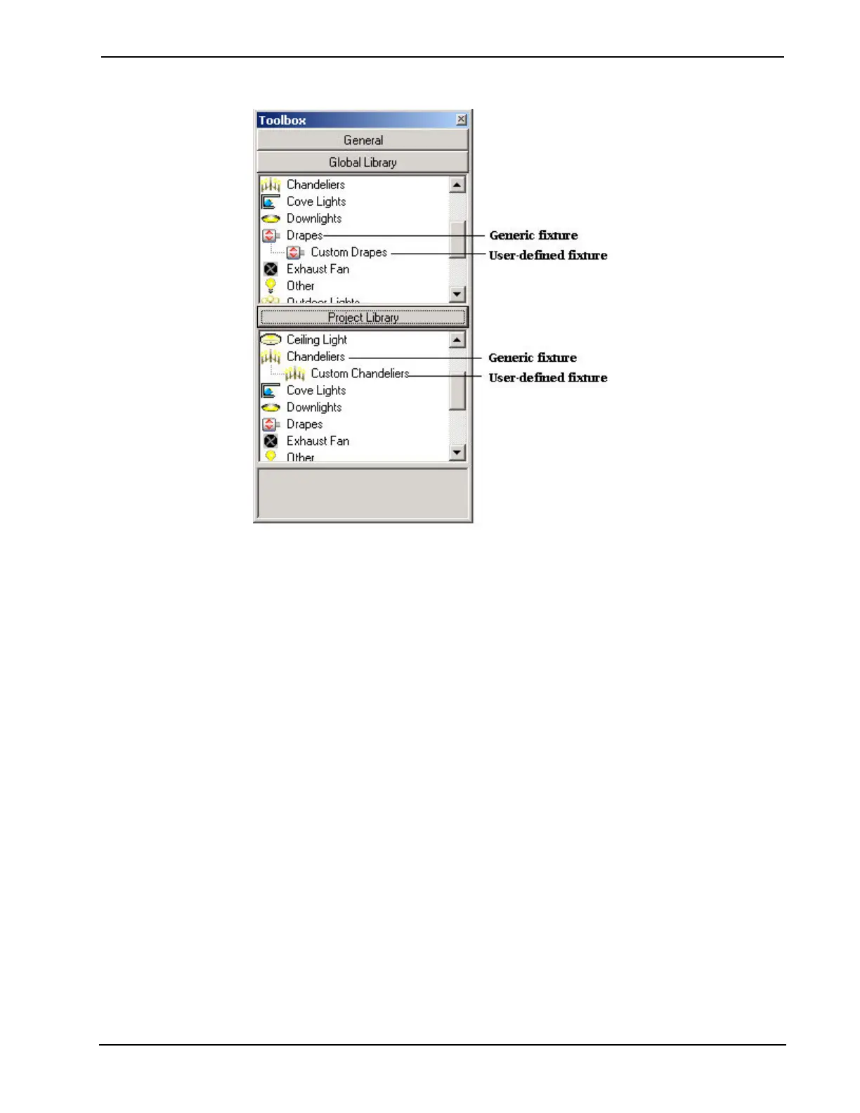 • Drag the generic fixture from either library in the Fixtures toolbox to a room.