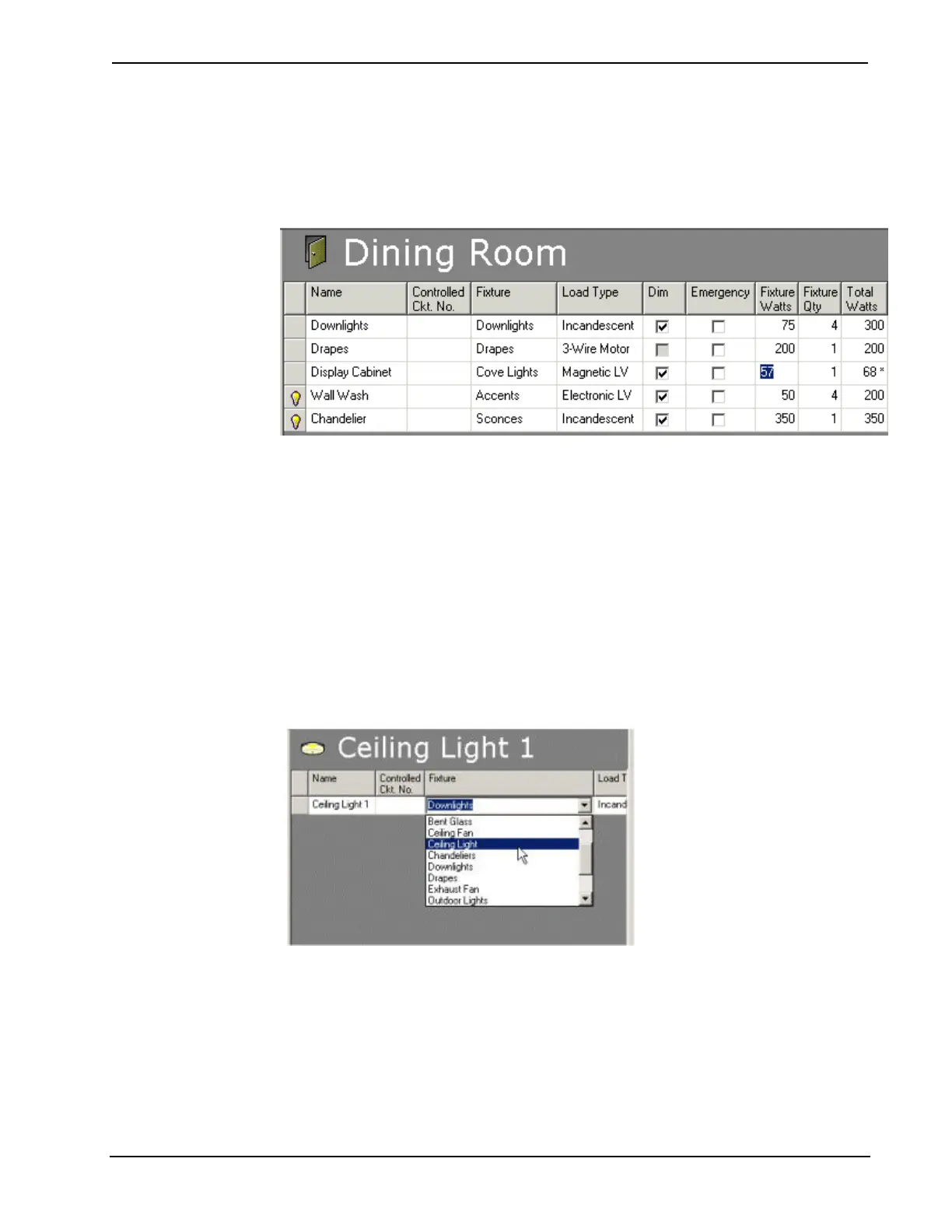 wall sconces, ceiling fans, and accents. Each fixture has a default load type, dimming