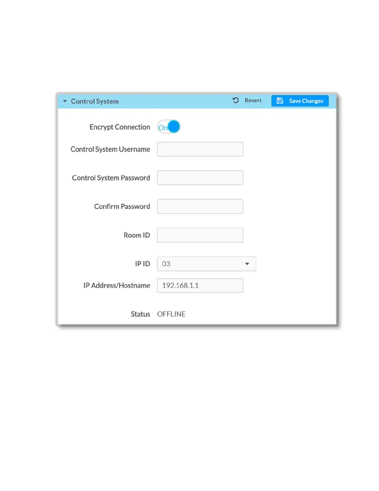 Note that when encryption is enabled, Control System Username, Control