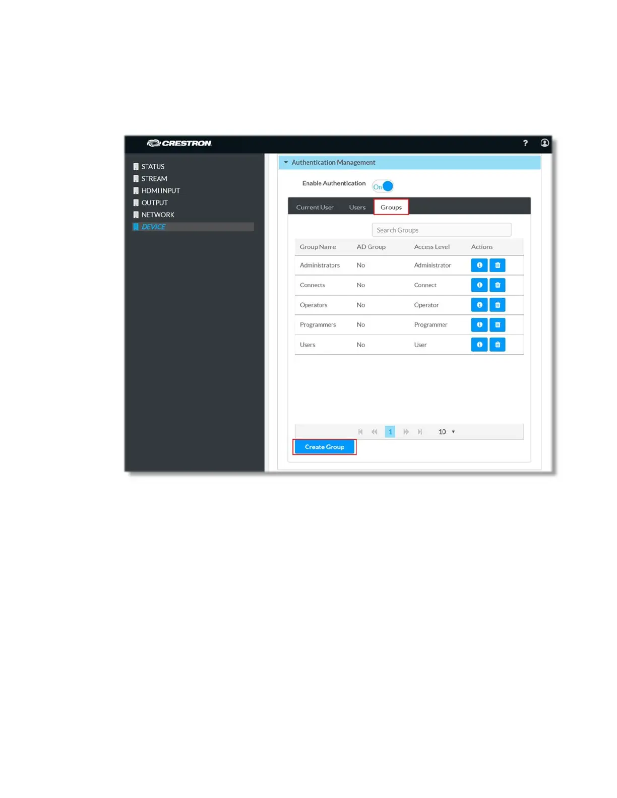 2. Navigate to the Device page, click on Authentication Management and select