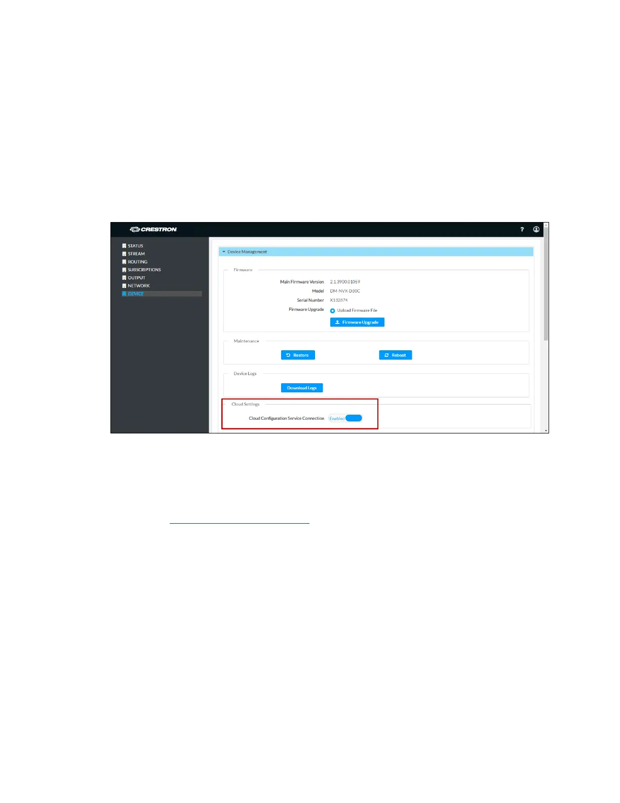 Configure the connection to the Crestron XiO Cloud service on the Device page. In the