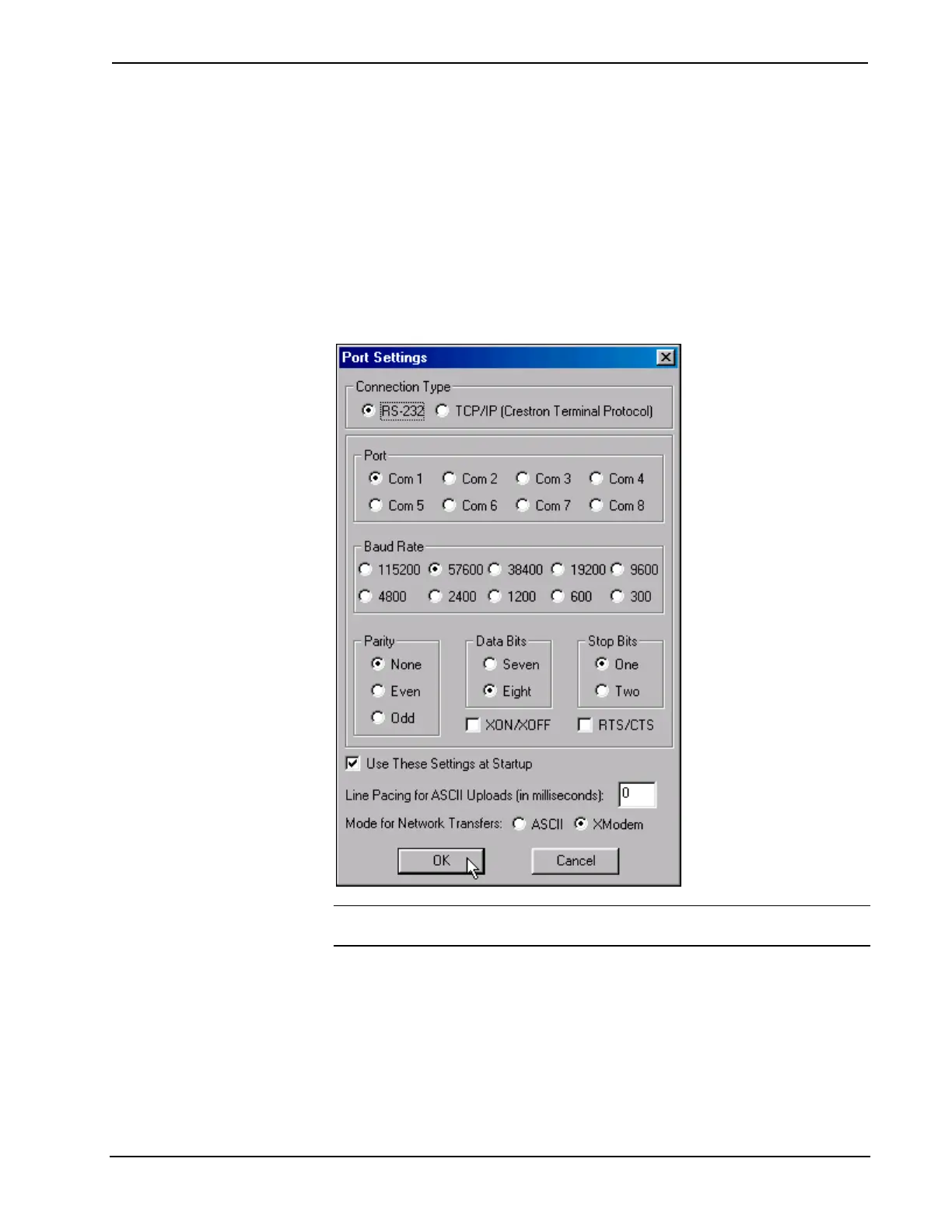 handshaking is required (do not check the XON/XOFF or RTS/CTS check boxes).