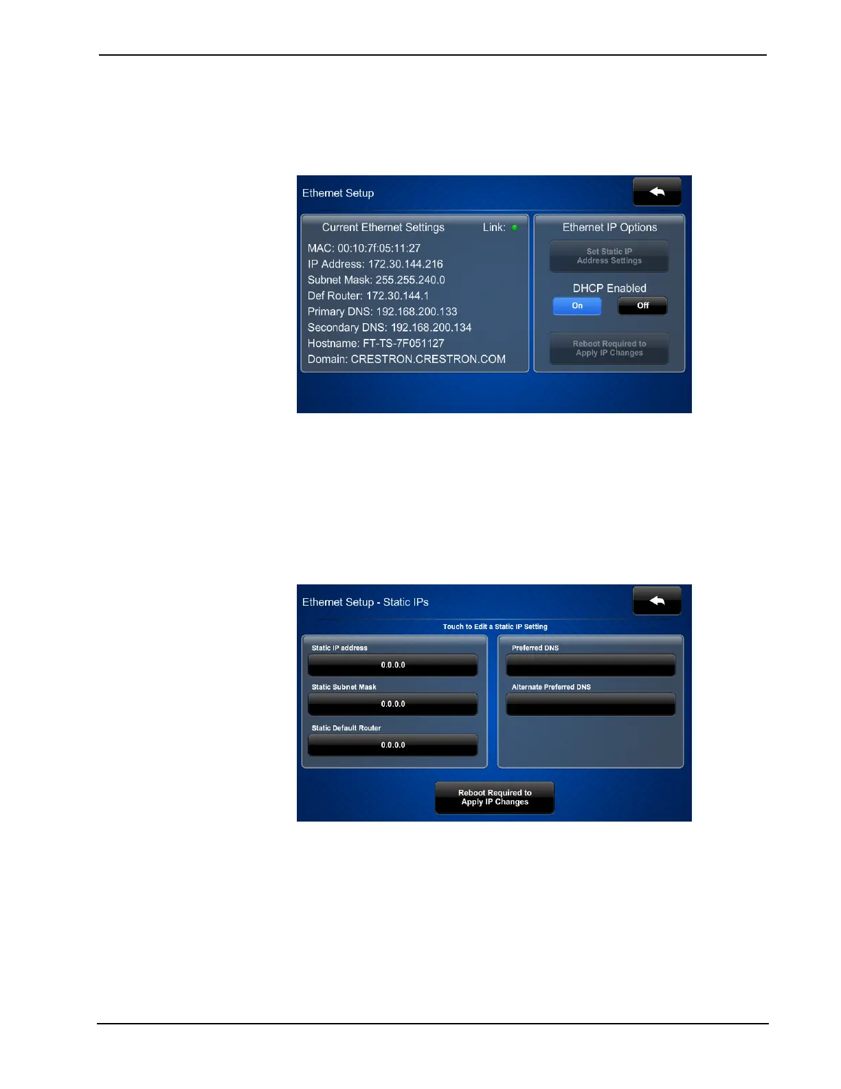 Touch Set Static IP Address Settings to display the “Ethernet Setup – Static IPs”