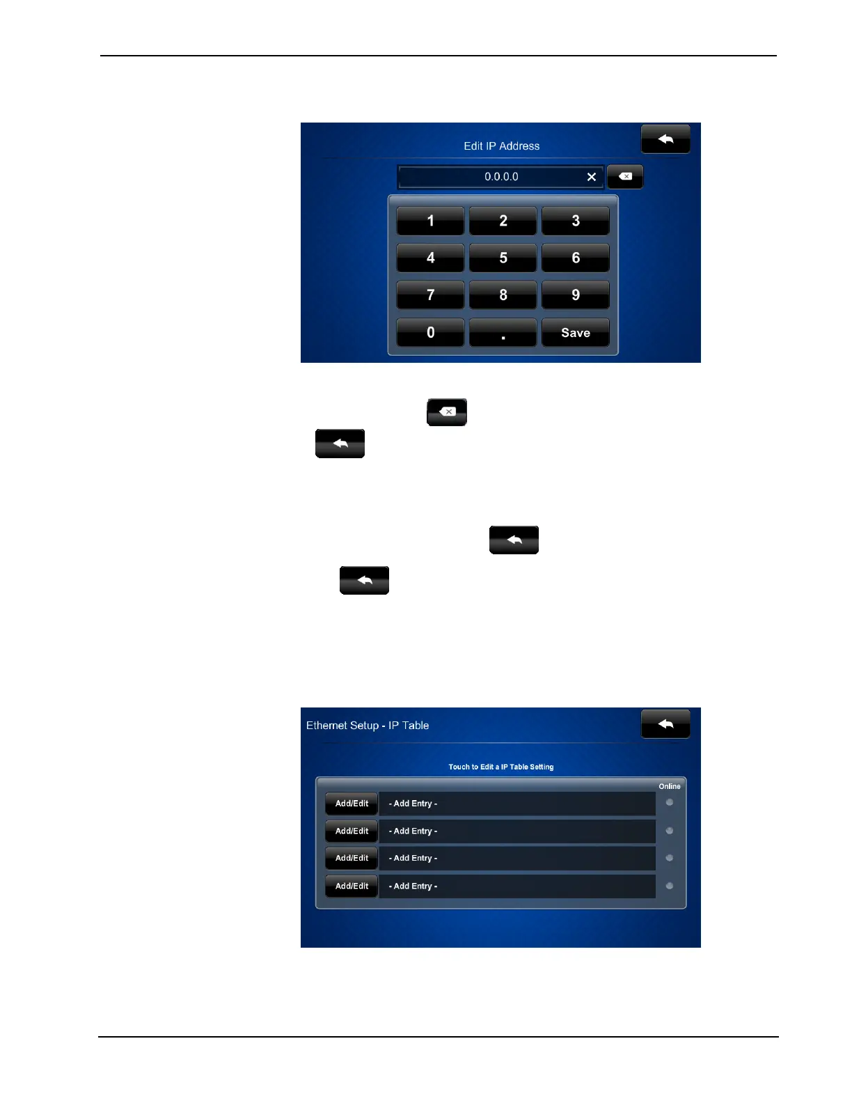 On the “Setup” menu, touch IP Table Setup to display the “Ethernet Setup – IP