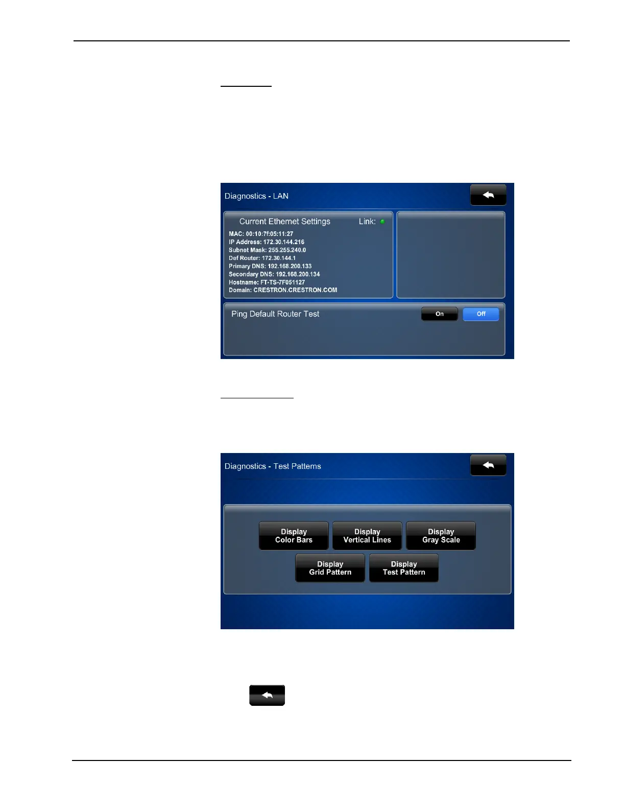 The “Diagnostics - Test Patterns” screen contains buttons for selecting the different