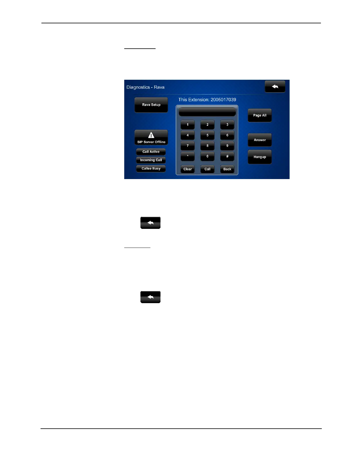 On the “Diagnostics” menu, touch Rava Test to display the “Diagnostics – Rava”