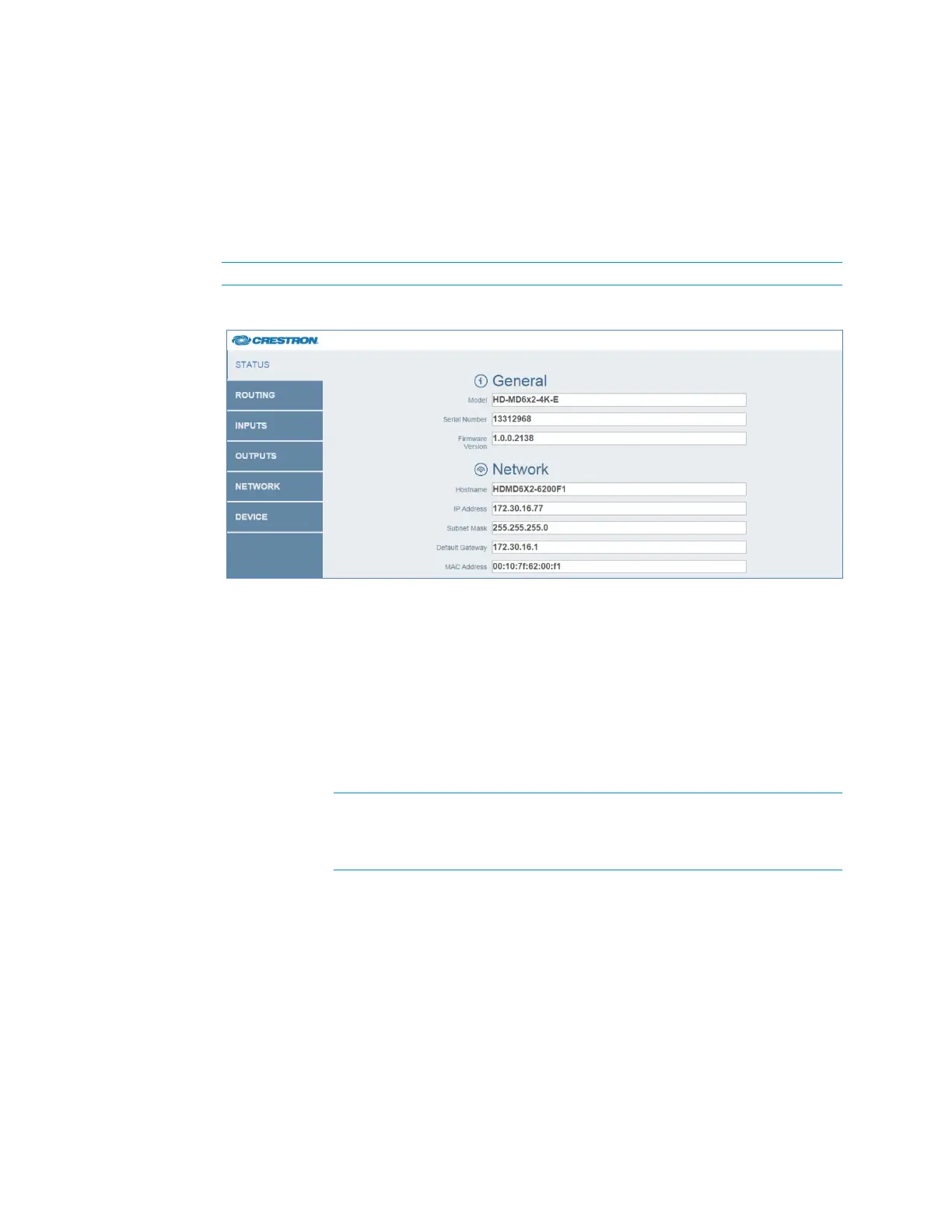 General information, such as model name, serial number, and firmware version of a