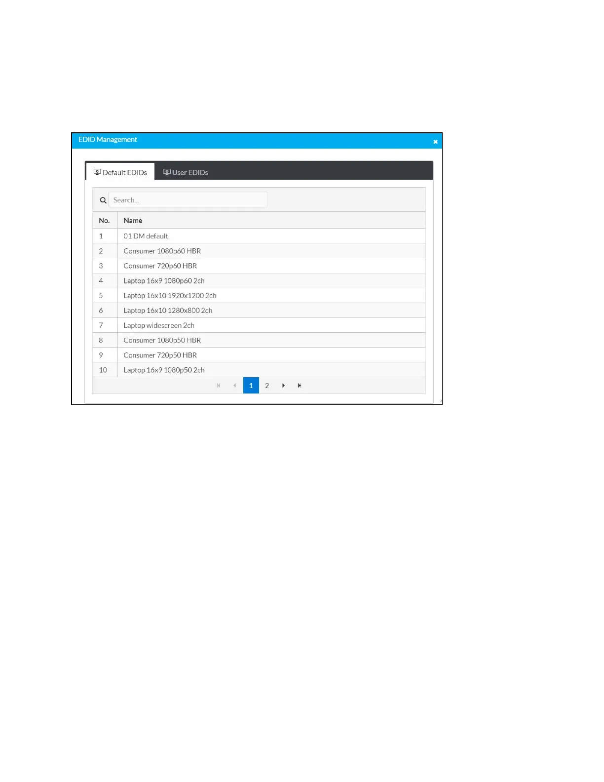 Built-in EDIDs are displayed in the Default EDIDs tab of the EDID Management dialog. The