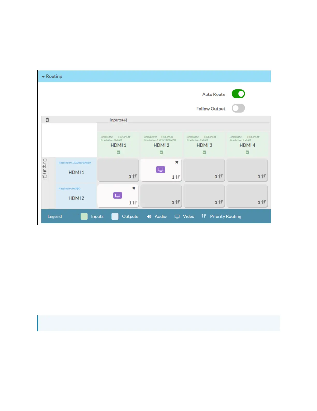 The Routing section can be used to enable or disable automatic routing between video inputs to
