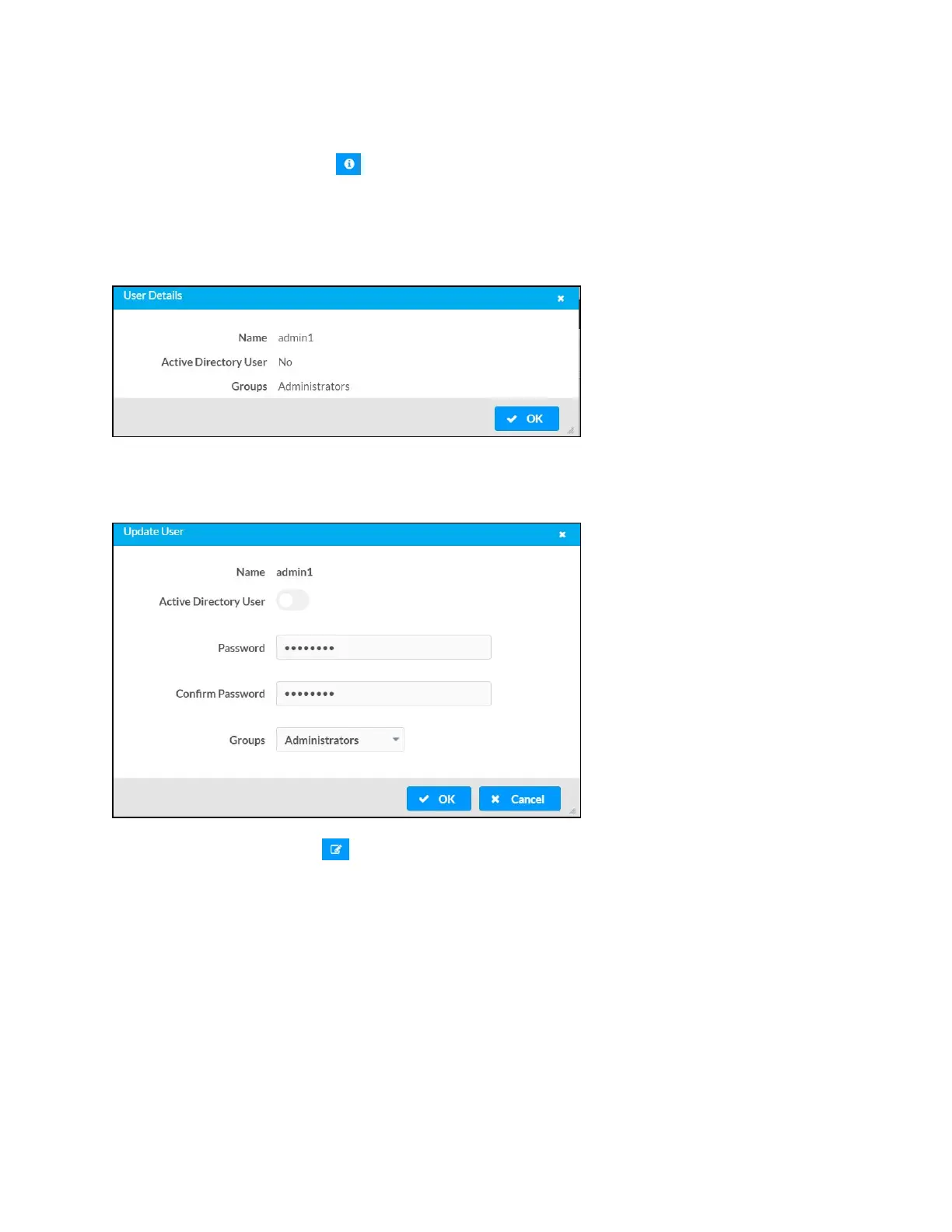 The Update User dialog also displays the following read-only information for the selected user.