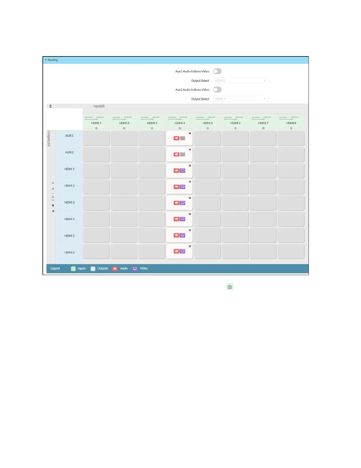 1. To manually route a local input to the output, click the output box next to the name of the