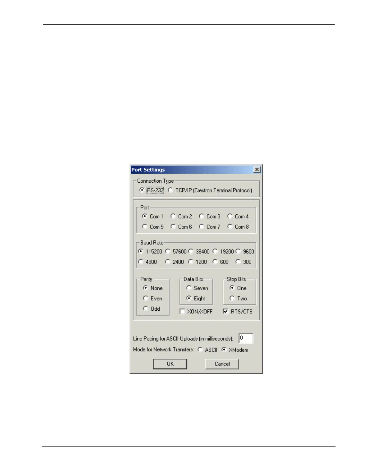 • Baud rate = 115200 for 2-Series control systems; 57600 for X-Series; 38400