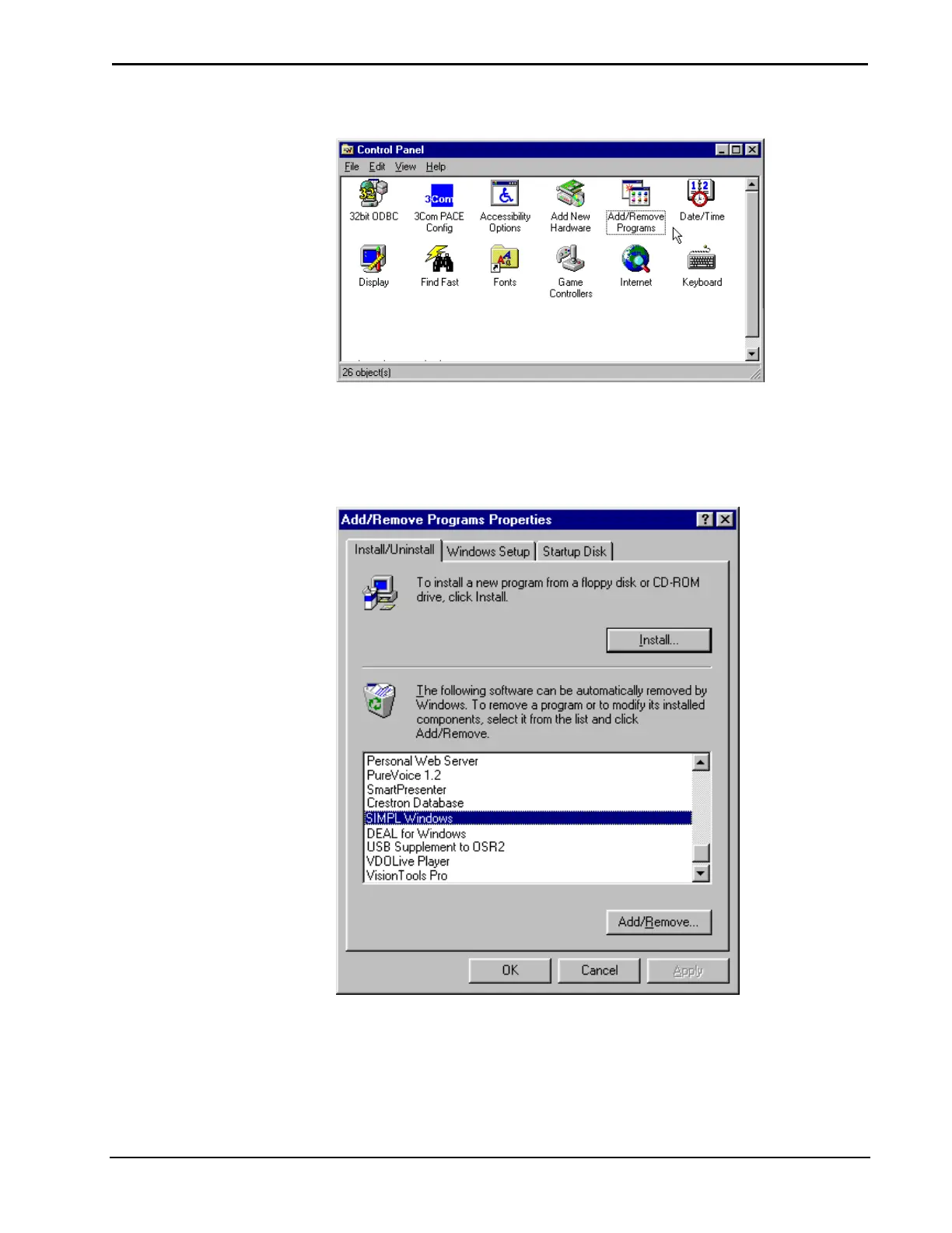 Select "Add/Remove Programs". The "Add/Remove Programs Properties" dialog