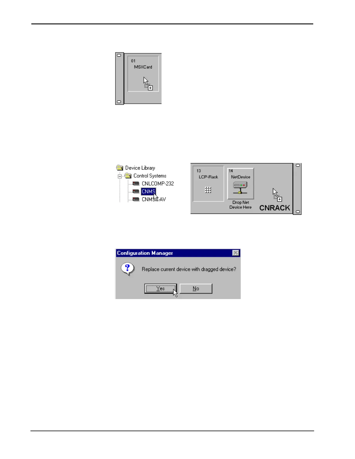 Devices are replaced by selecting a new device, dragging it into Network System