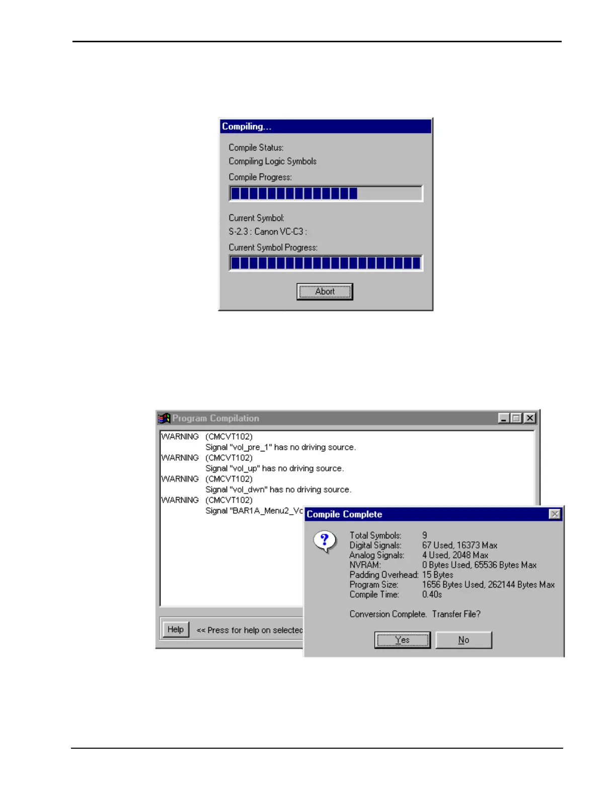 "Compile Complete" Dialog Box & "Program Compilation" Window