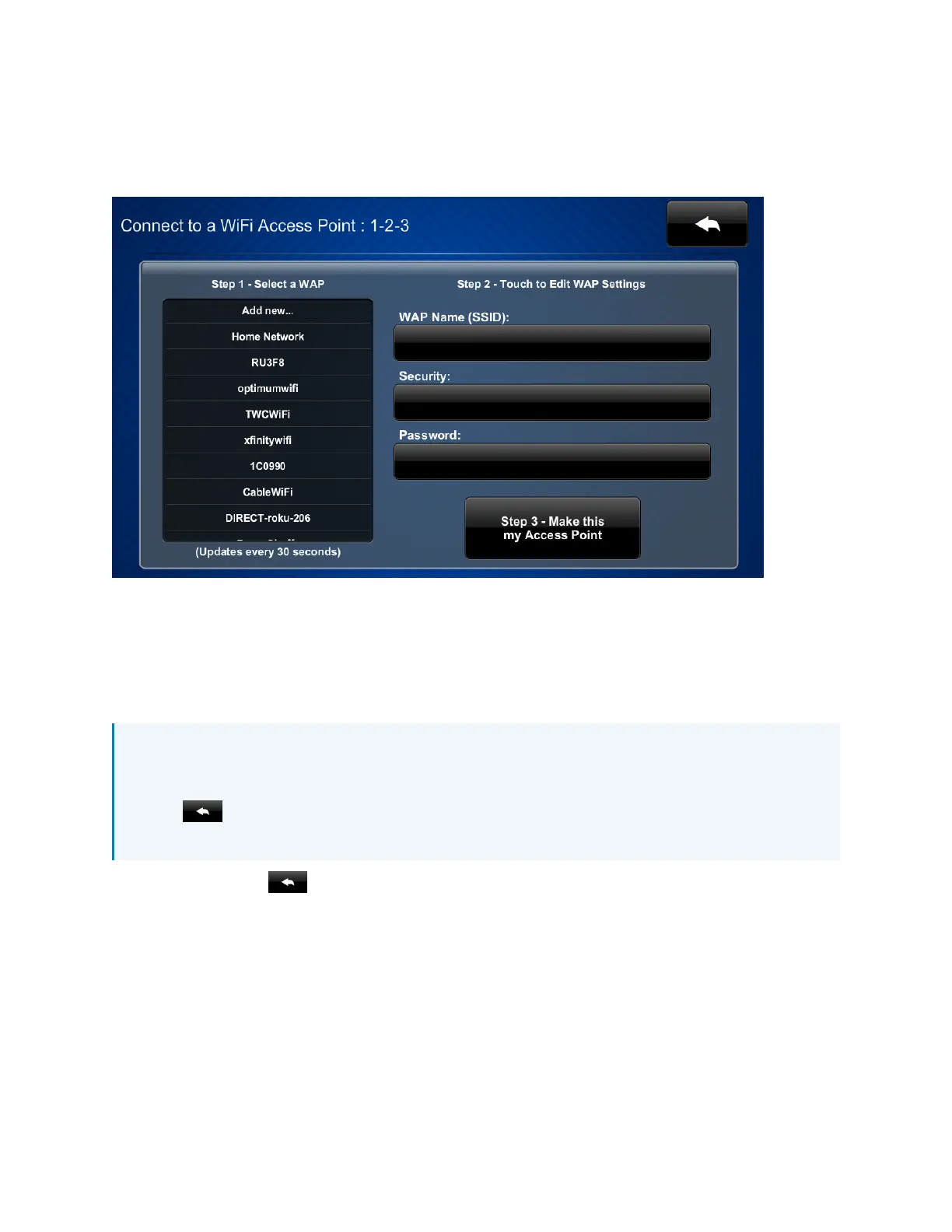 Use the Connect to a Wi-Fi Access Point: 1-2-3 screen to connect the touch screen to an existing