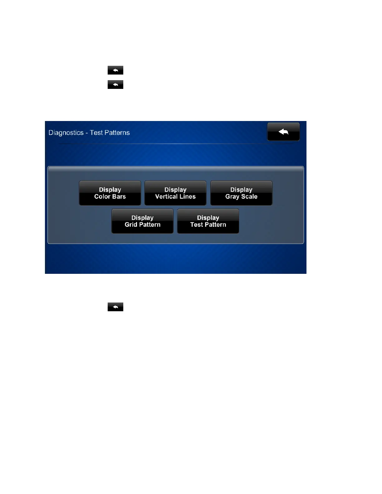 Tap Test Patterns on the Diagnostics screen to display the Diagnostics - Test Patterns screen.