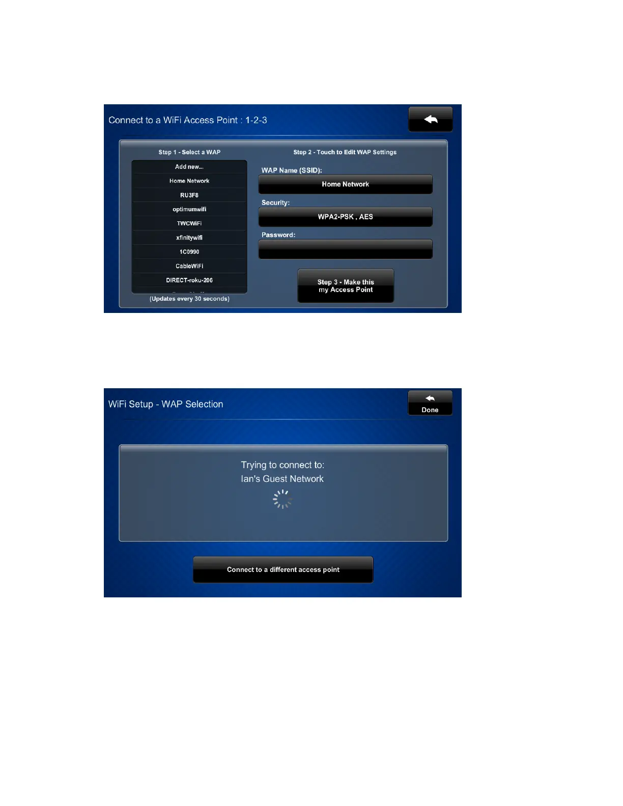 point to return to the Connect to a Wi-Fi Access Point:1-2-3 screen.