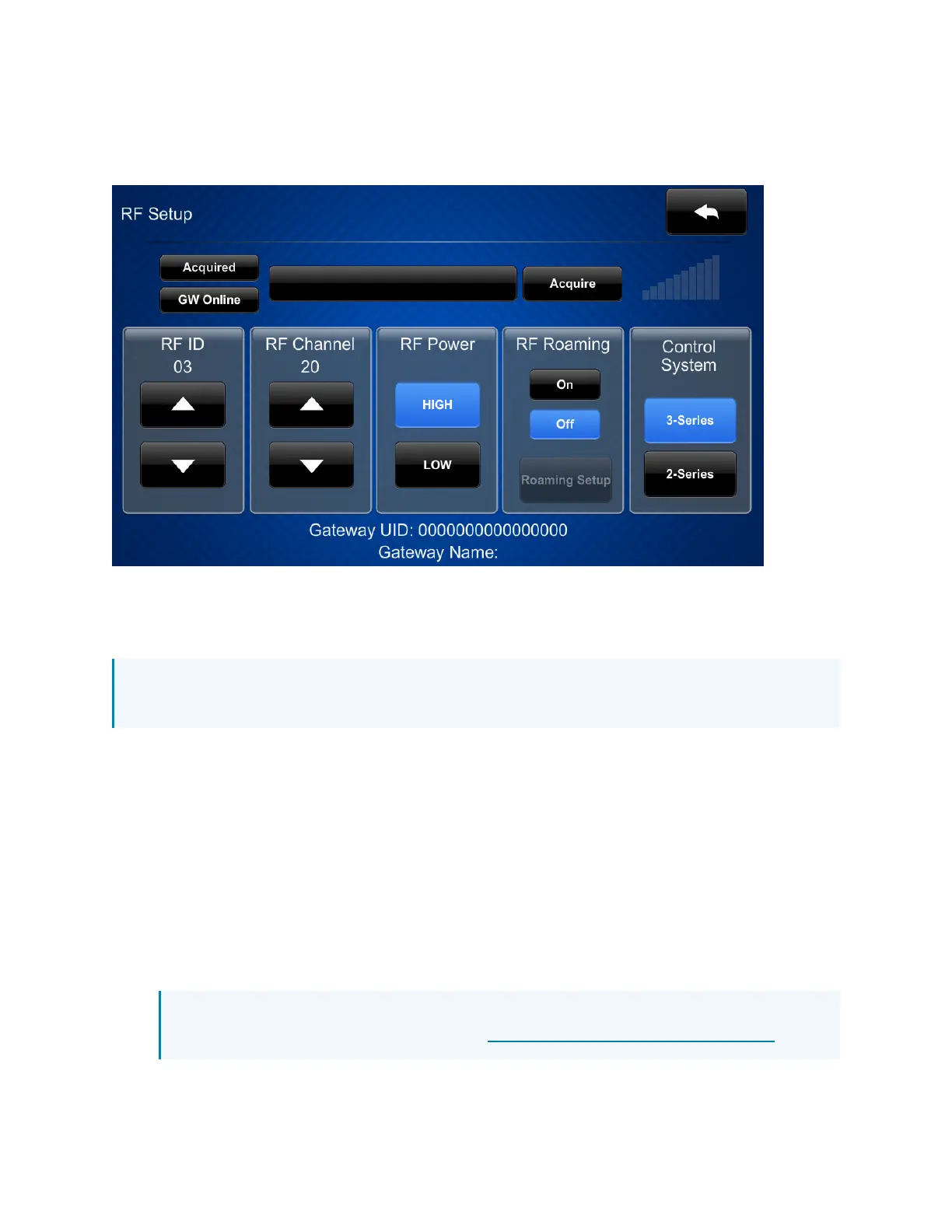 The RFSetup screen provides controls that can be used to acquire the TST-902 to a Crestron