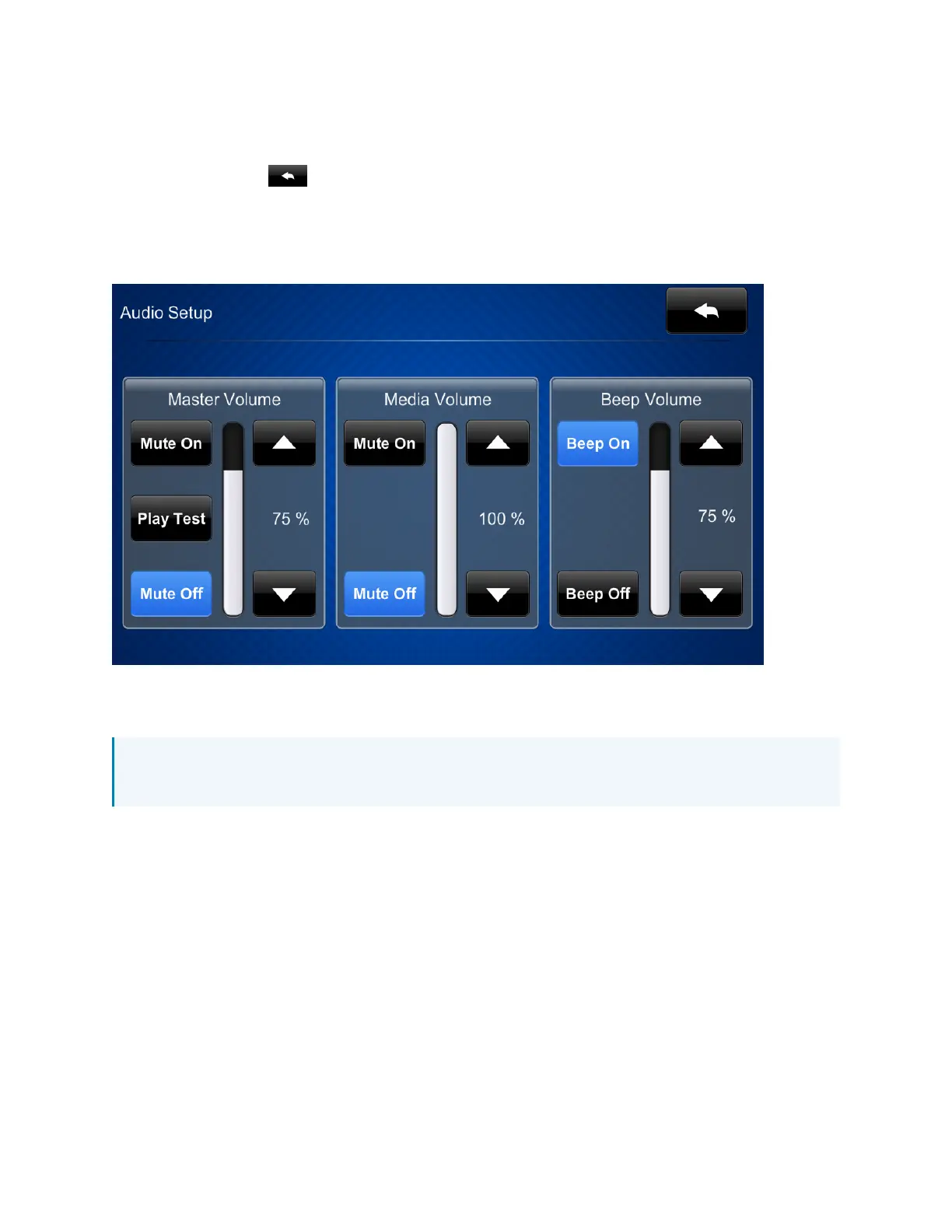 Use the Audio Setup screen to control the main volume, media volume, and beep volume settings