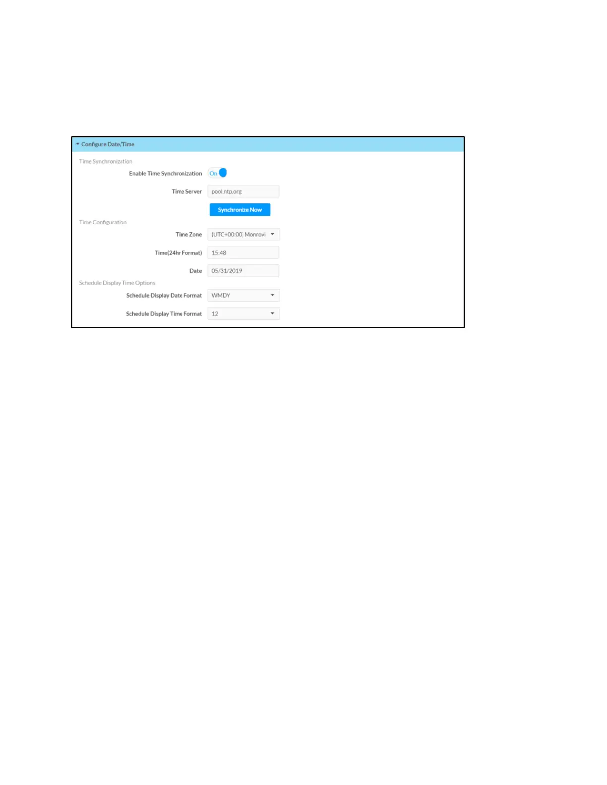 Enable Time Synchronization: Toggle the switch to turn time synchronization via