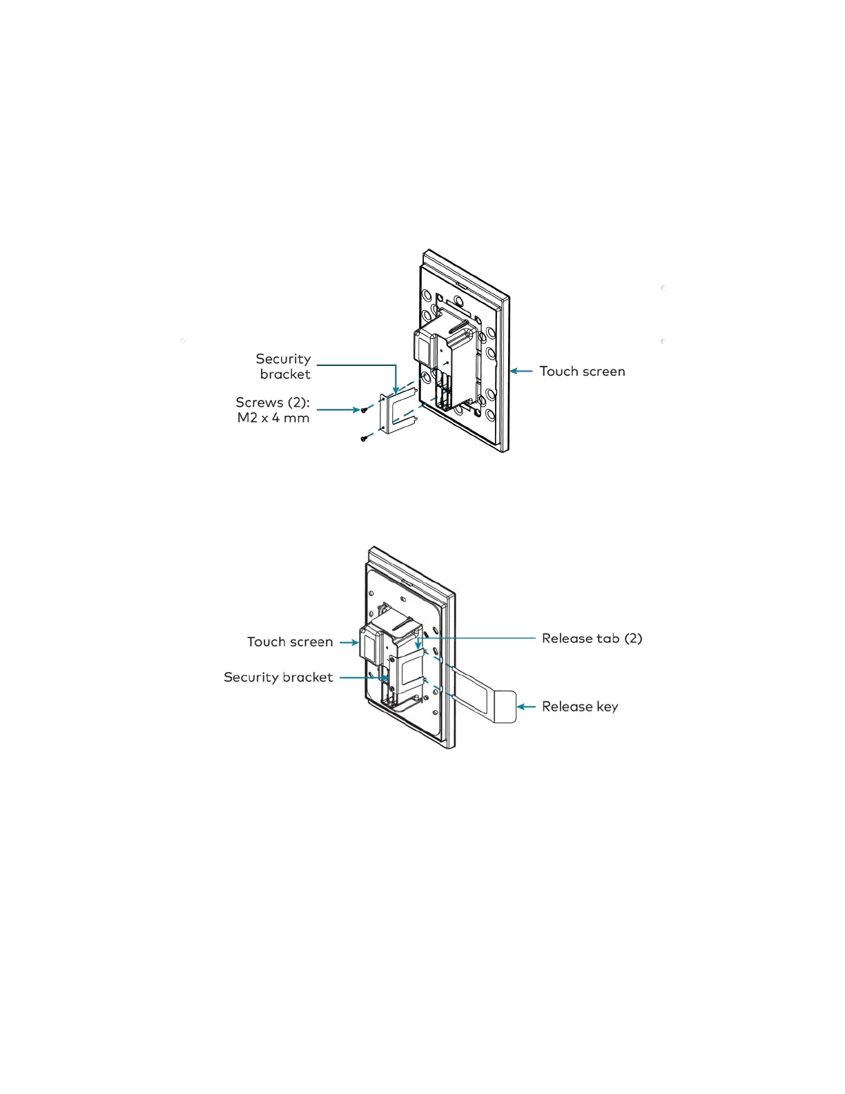 Use the two M2 x 4 mm screws to attach the security bracket to the touch screen rear housing as