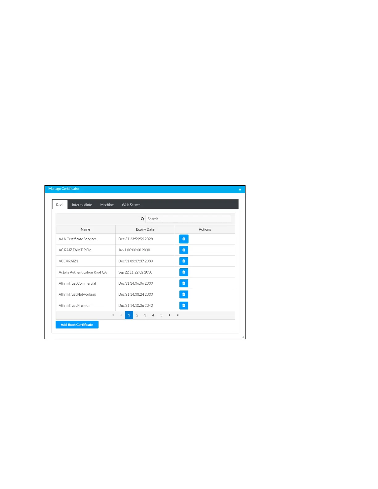 Manage Certificates Dialog Box - Root Tab