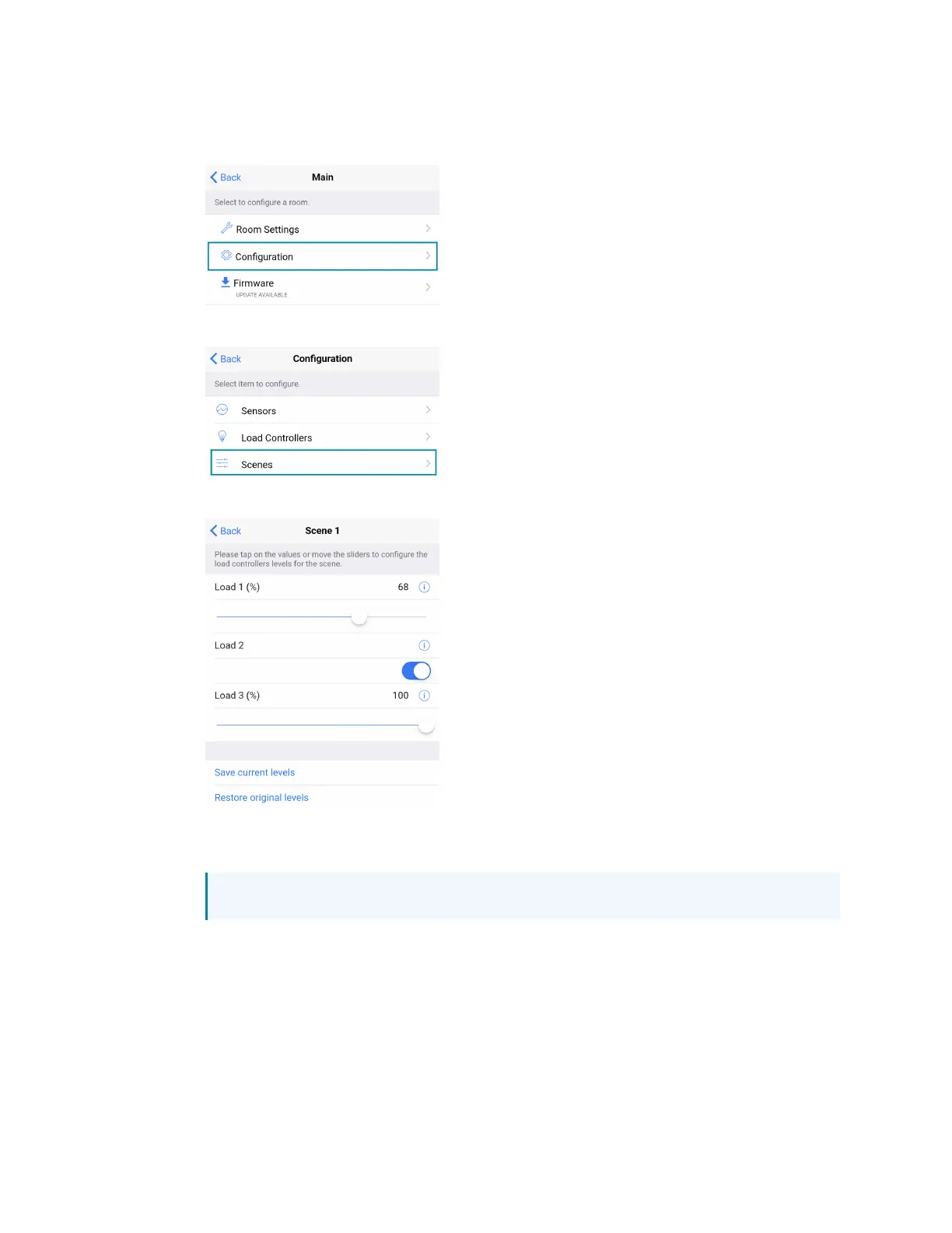3. Recall Scene 1 and adjust load levels.