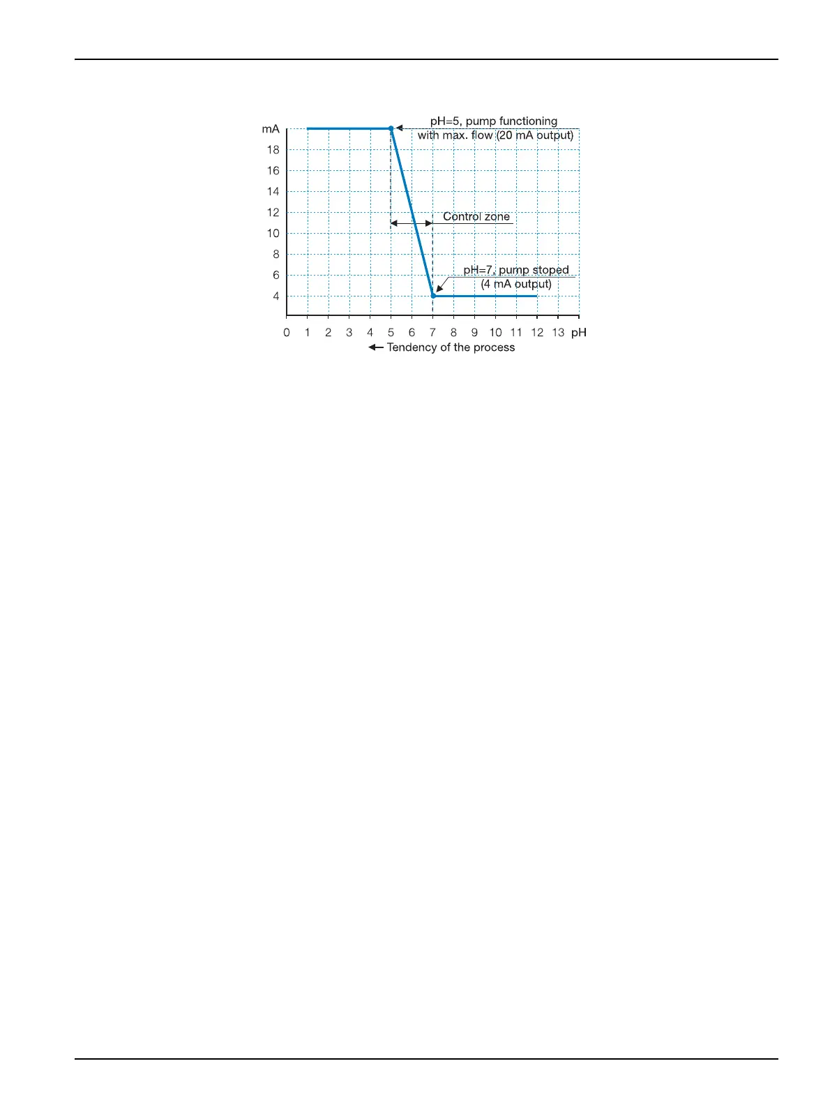20 mA = pH 5. Pump dispensing at maximum.