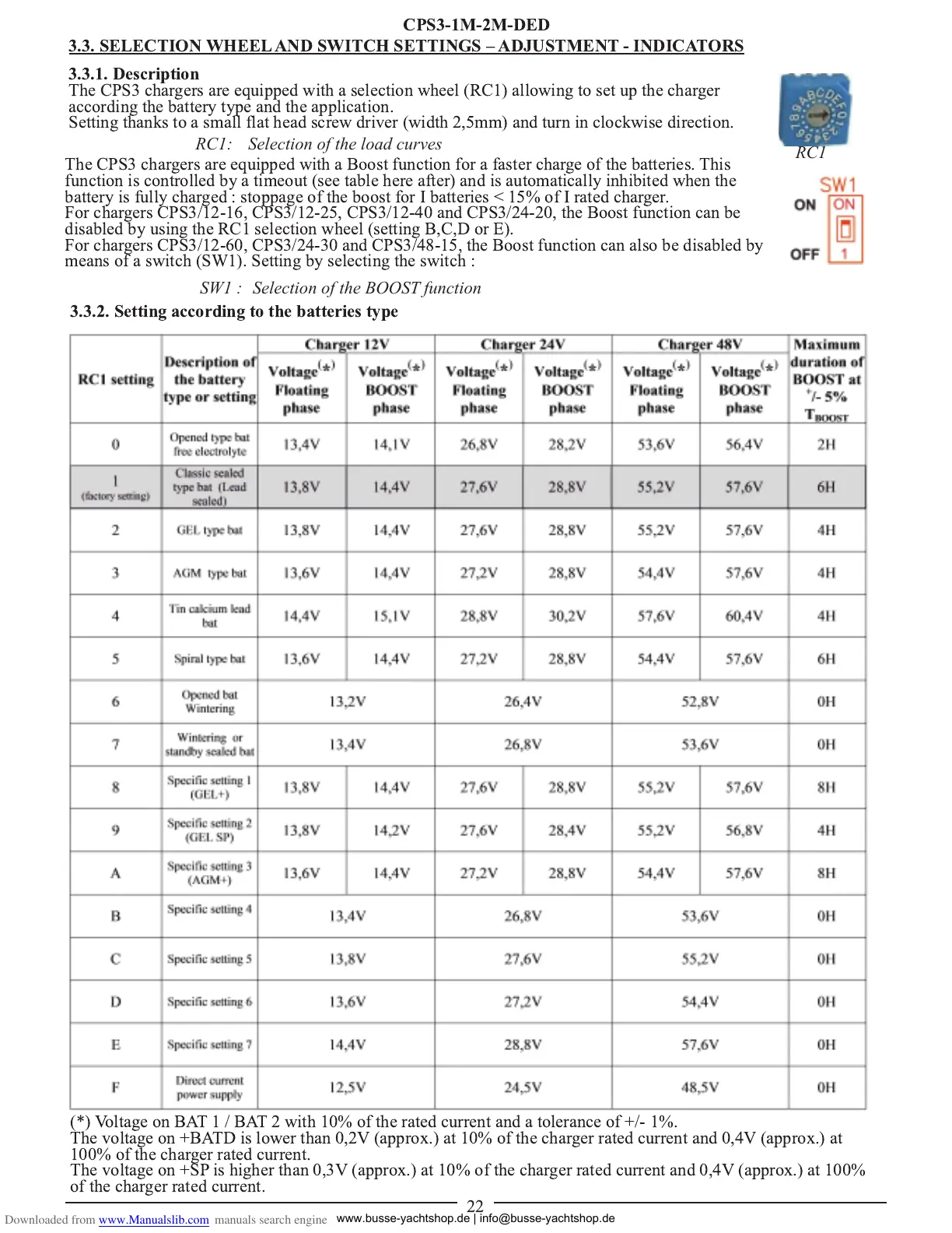 For chargers CPS3/12-60, CPS3/24-30 and CPS3/48-15, the Boost function can also be disabled by