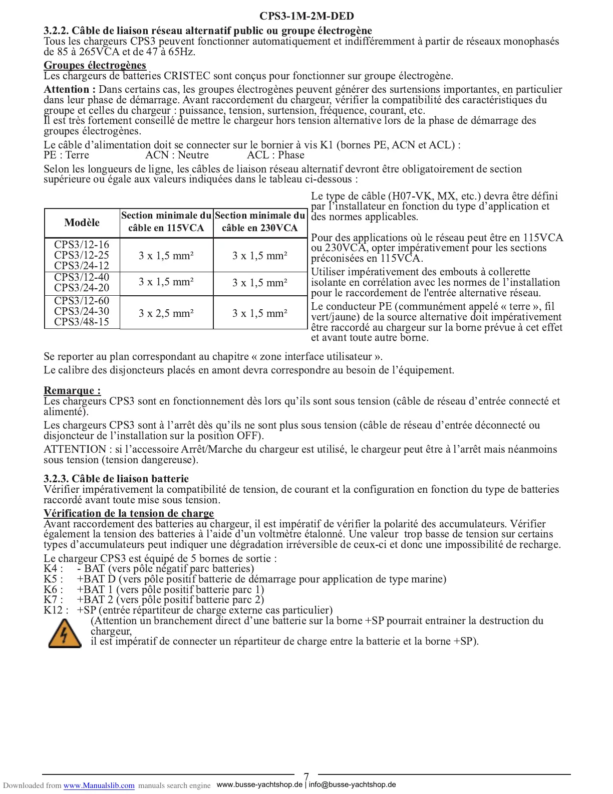 Cristec CPS3 12V/16A - Câble de Liaison Réseau Alternatif Public Ou Groupe Électrogène; Câble de Liaison Batterie