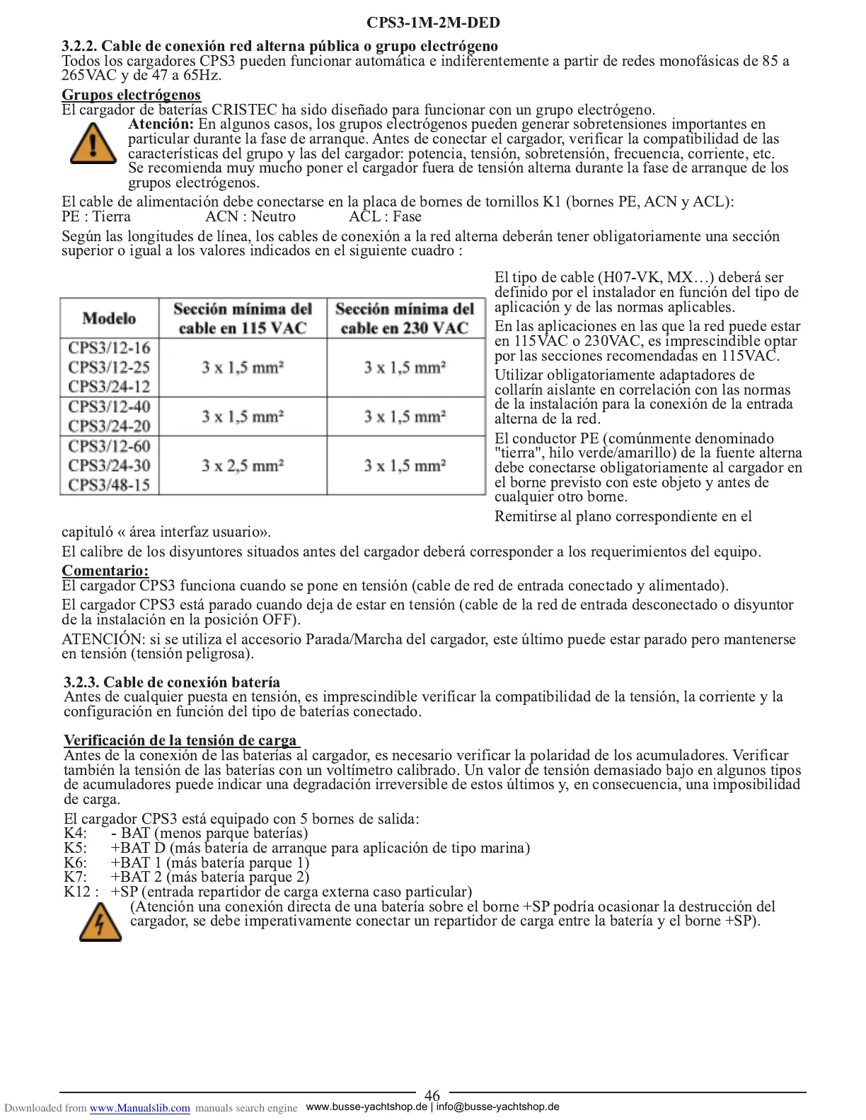 Según las longitudes de línea, los cables de conexión a la red alterna deberán tener obligatoriamente una sección