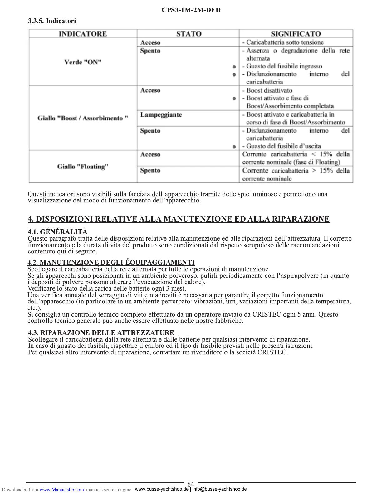Cristec CPS3 12V/25A - Disposizioni Relative Alla Manutenzione Ed Alla Riparazione; Généralità; Indicatori; Manutenzione Degli Équipaggiamenti